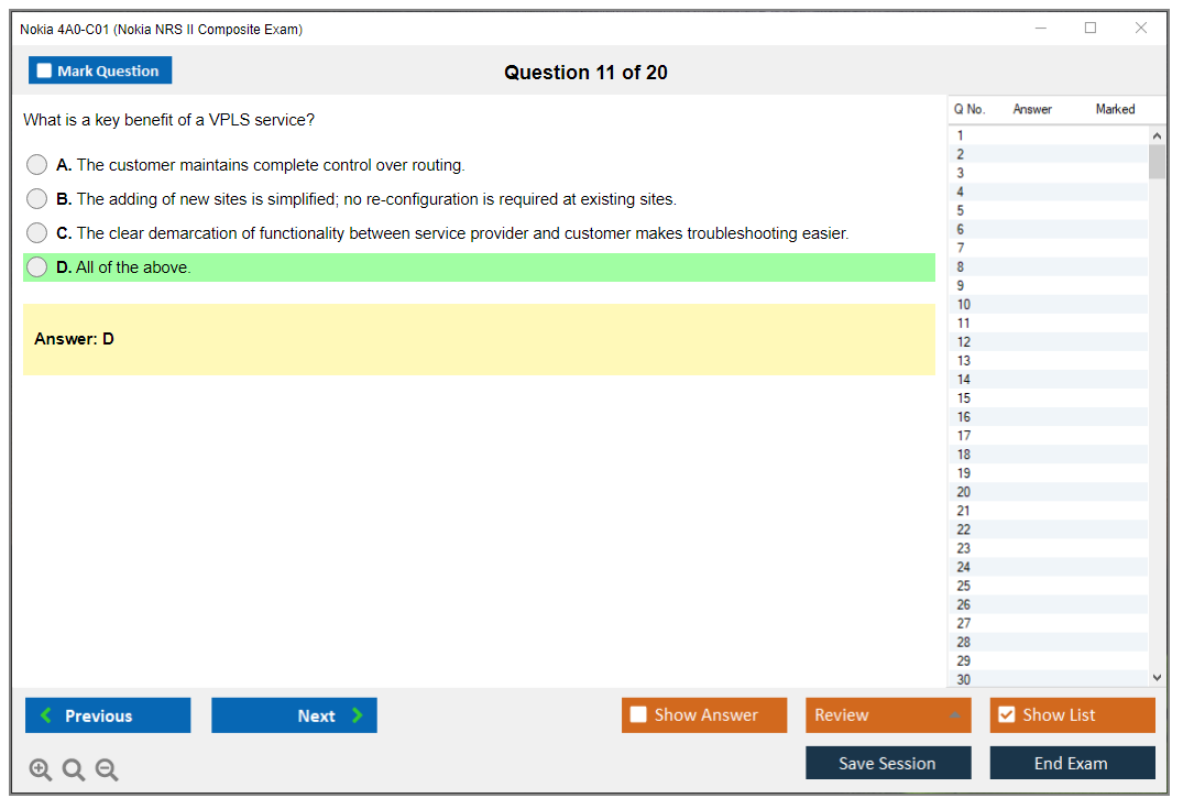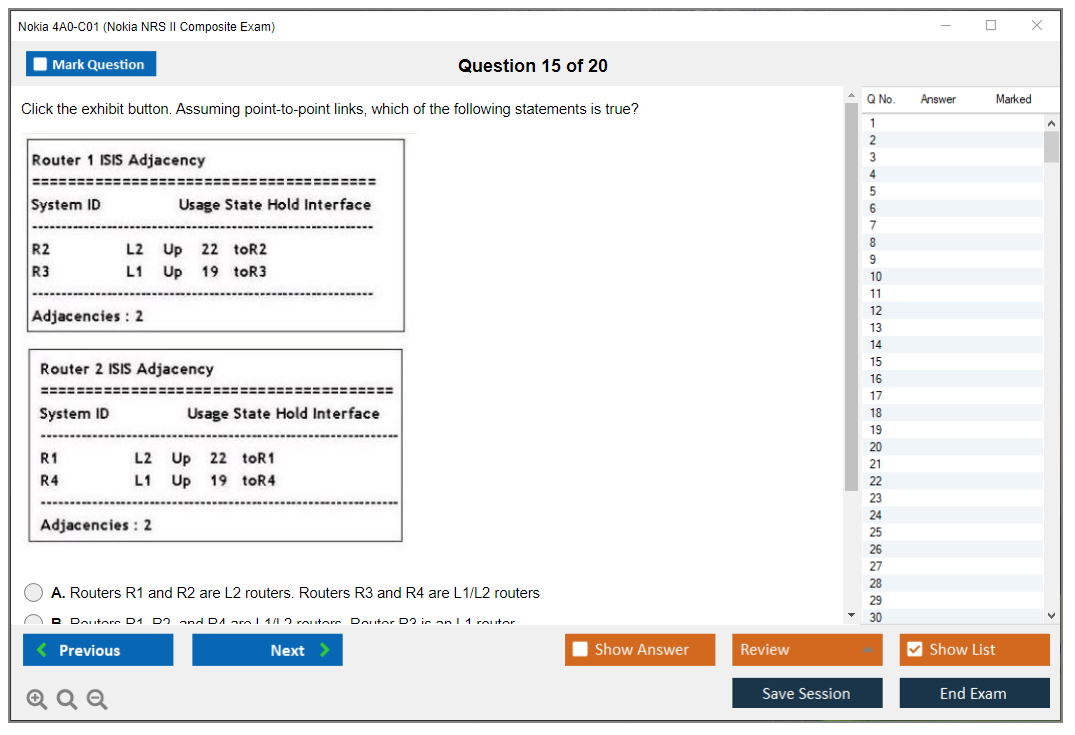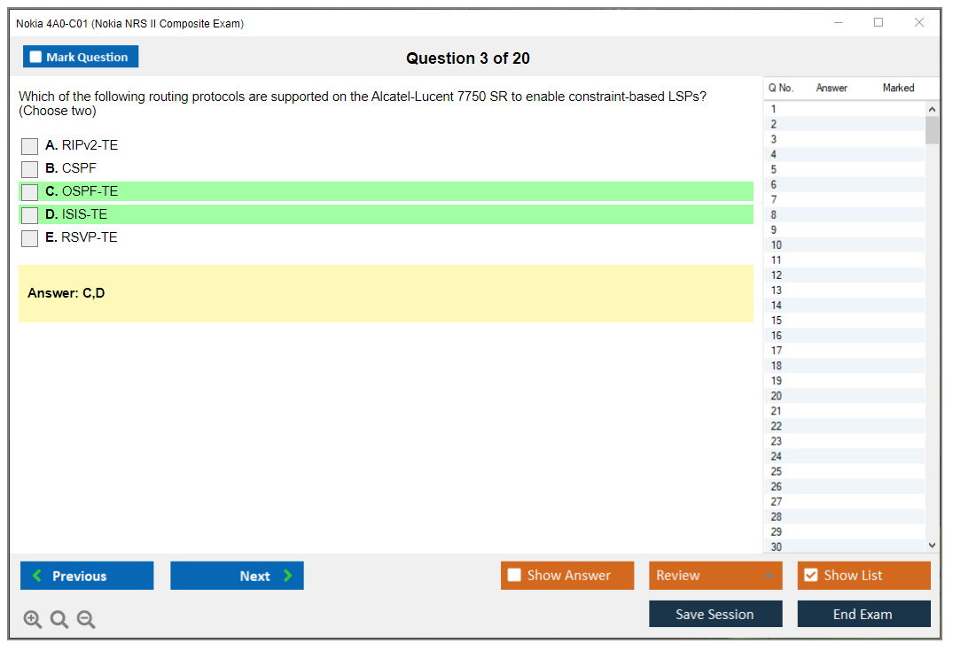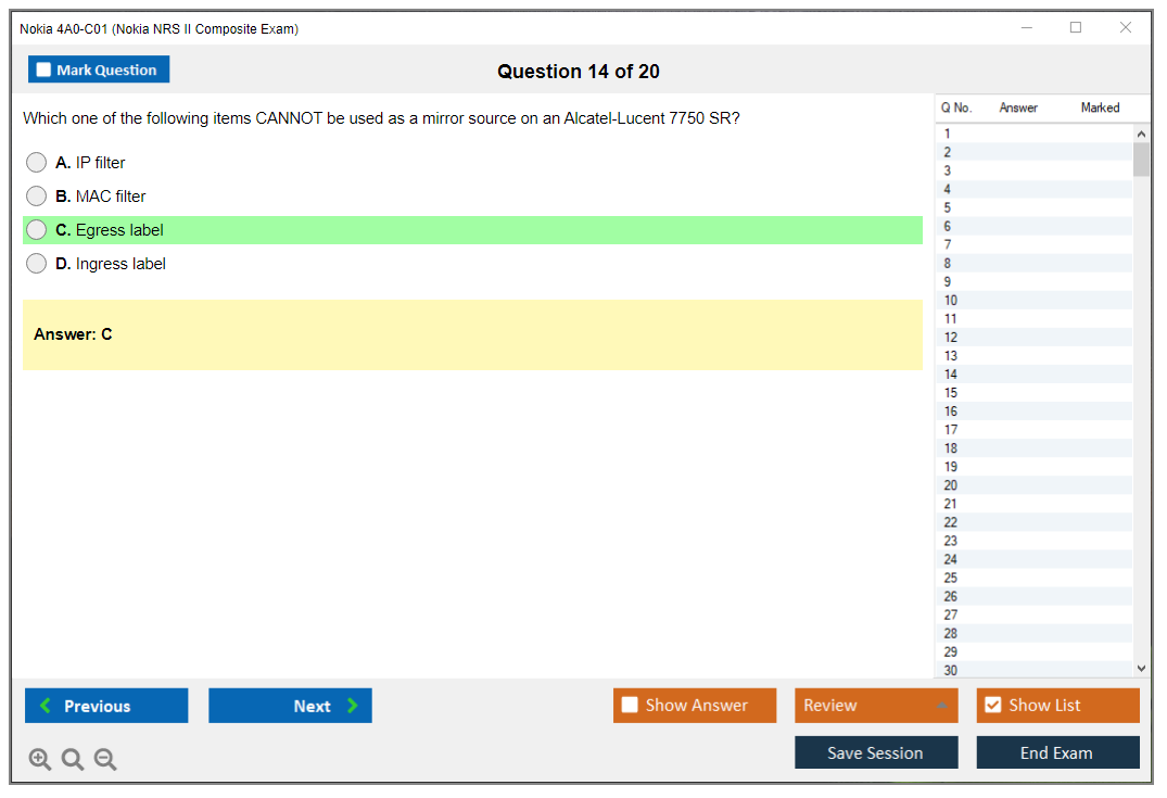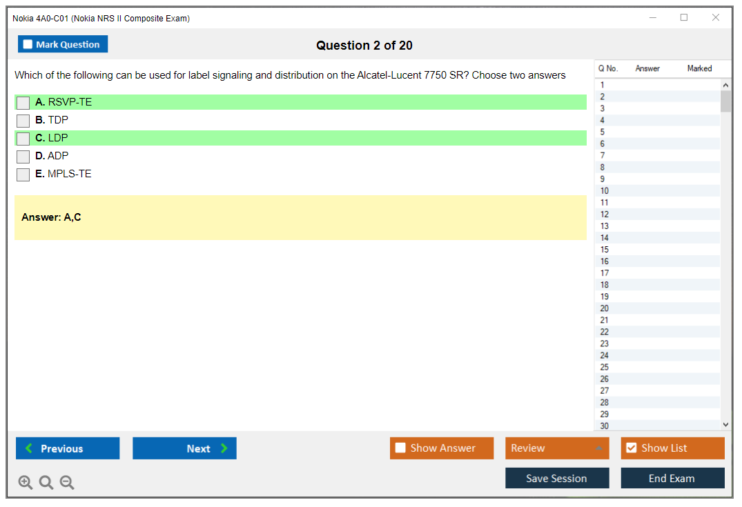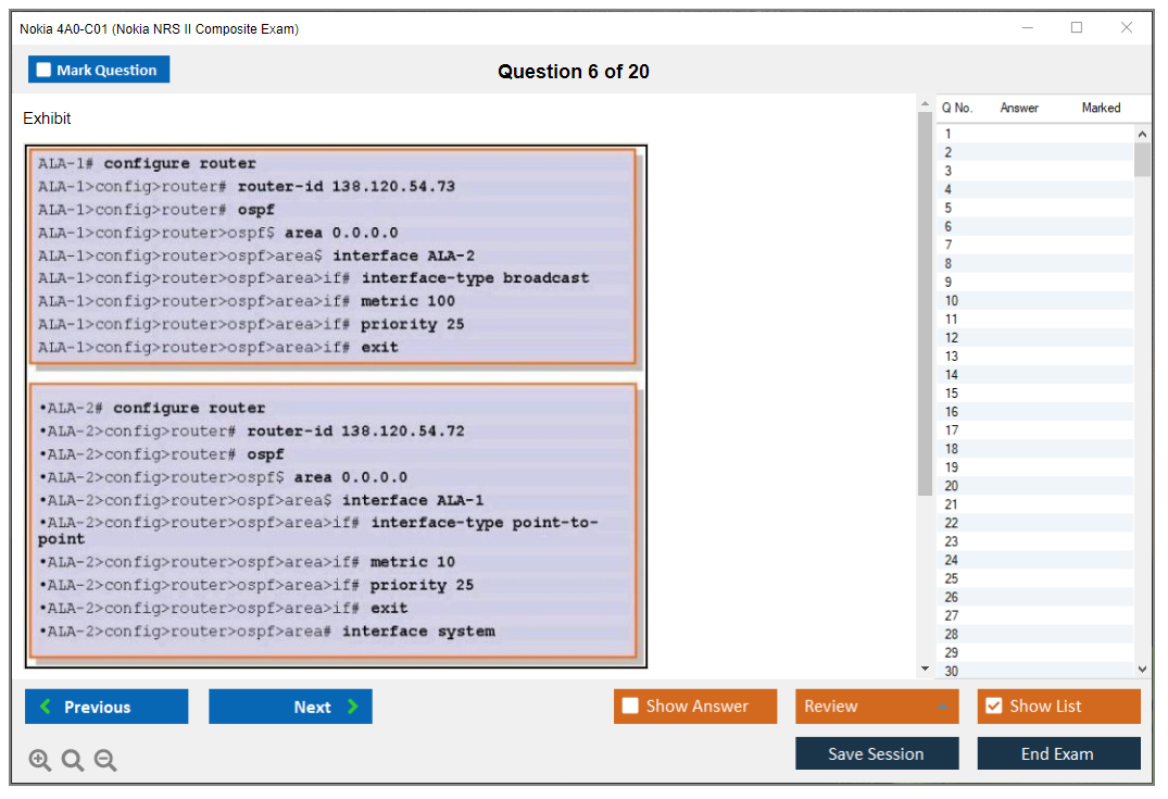 The Nokia 4A0-C01 (Nokia NRS II Composite Exam) is a certification exam that validates the knowledge and skills of individuals in the field of Nokia Service Routing. This exam is part of the Nokia Network Routing Specialist II (NRS II) certification track.