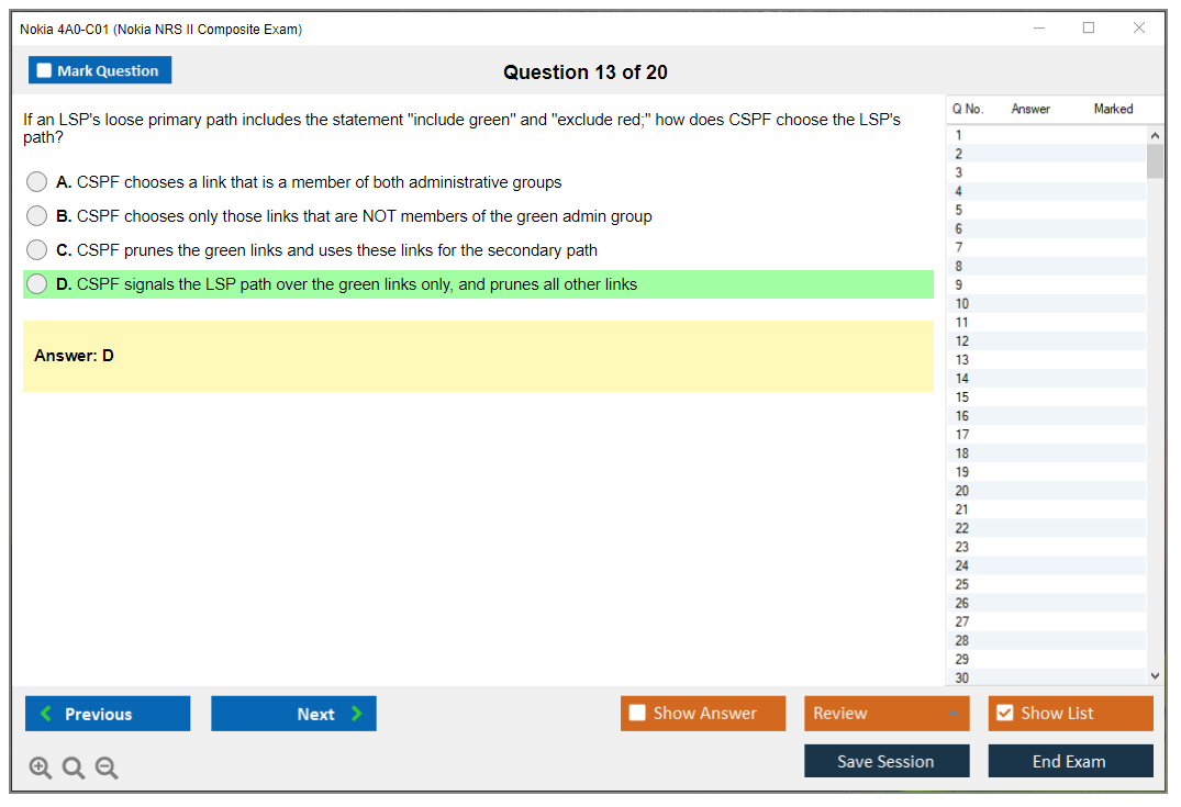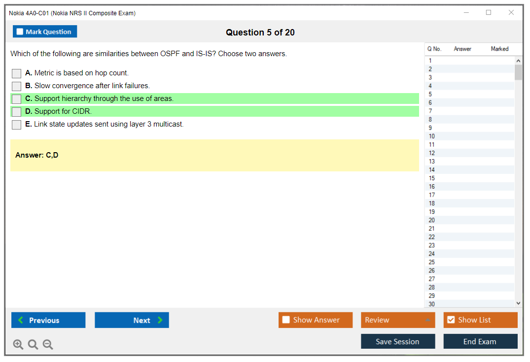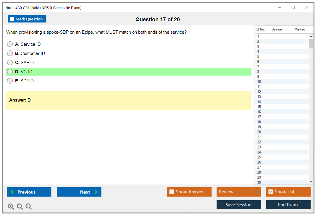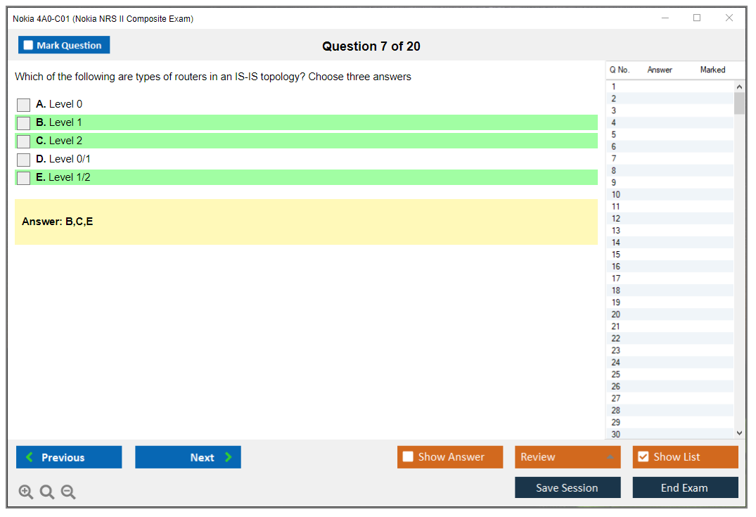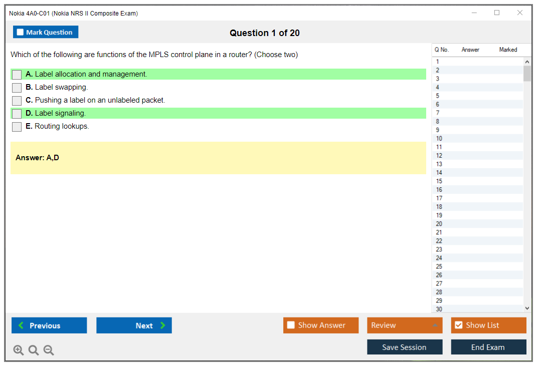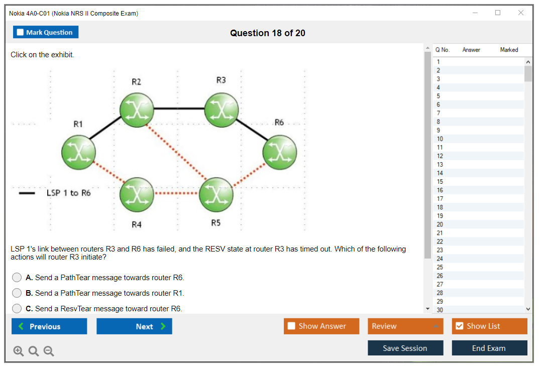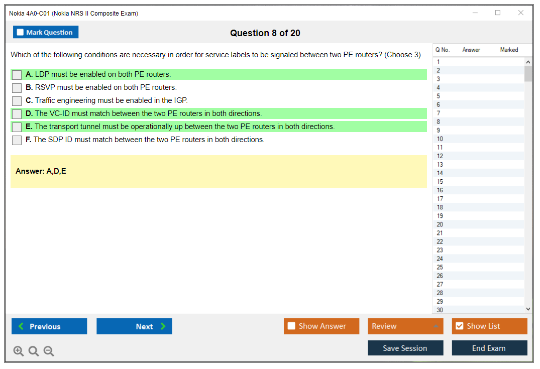 The Nokia 4A0-C01 (Nokia NRS II Composite Exam) is a certification exam that validates the knowledge and skills of individuals in the field of Nokia Service Routing. This exam is part of the Nokia Network Routing Specialist II (NRS II) certification track.