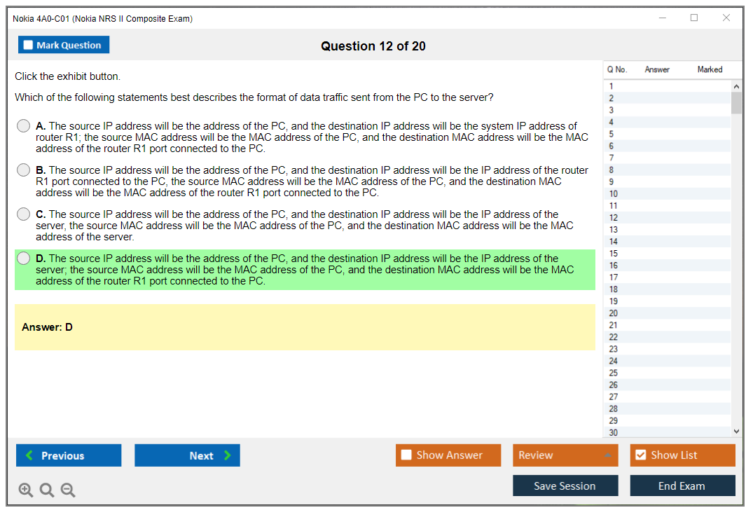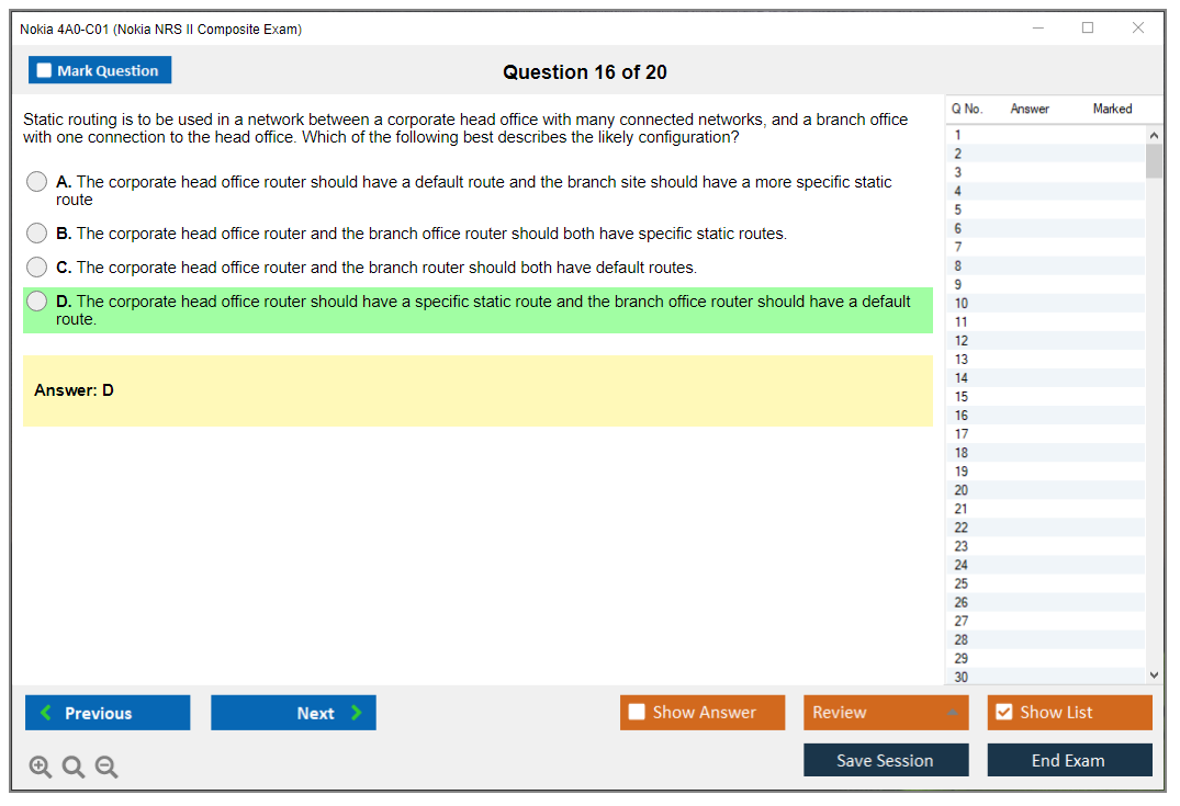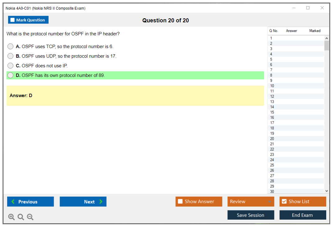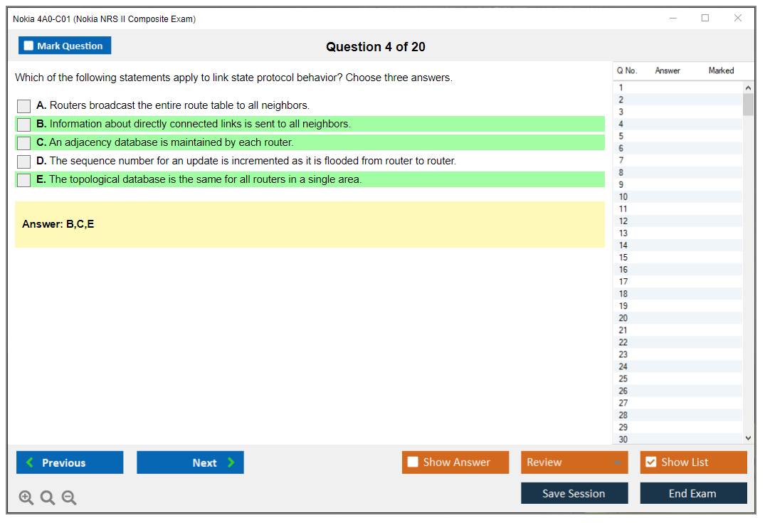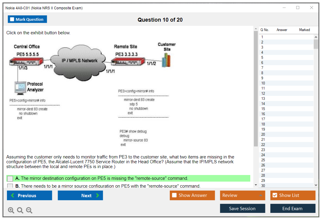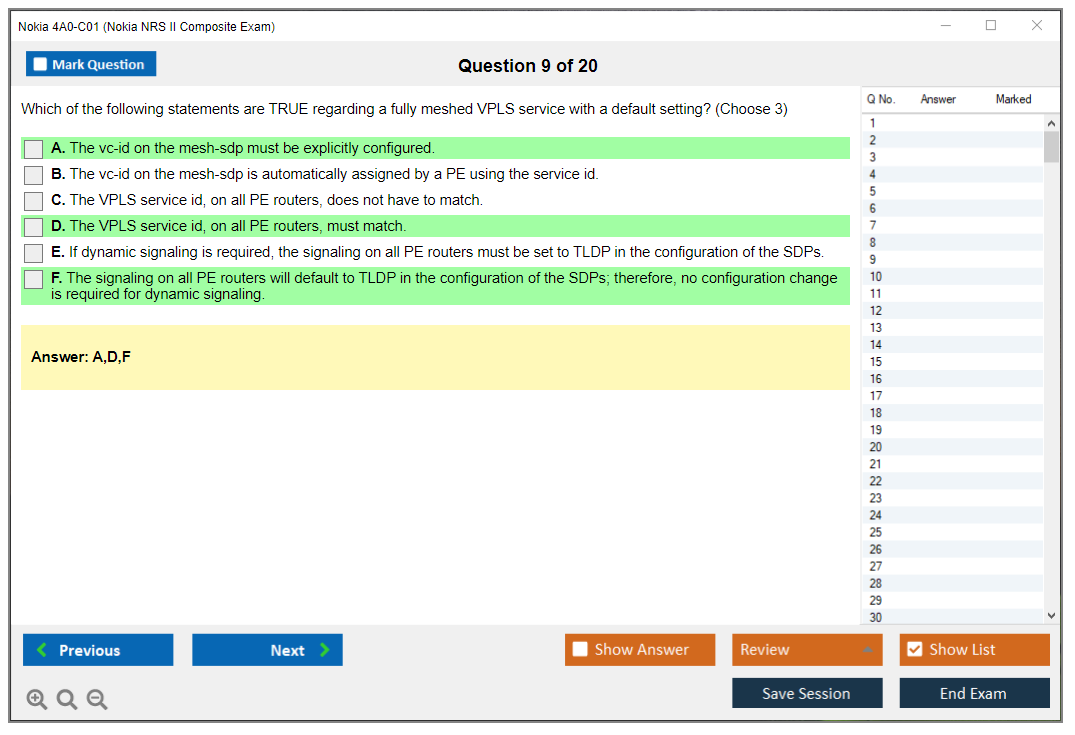 The Nokia 4A0-C01 (Nokia NRS II Composite Exam) is a certification exam that validates the knowledge and skills of individuals in the field of Nokia Service Routing. This exam is part of the Nokia Network Routing Specialist II (NRS II) certification track.