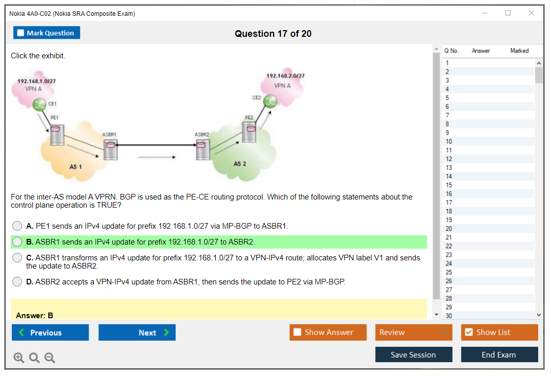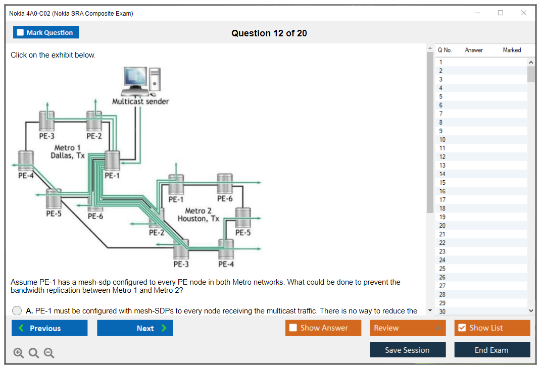 The Nokia 4A0-C02 (Nokia SRA Composite Exam) is a certification exam designed to validate the skills and knowledge required for professionals working with Nokia Service Routing Architecture. It covers a broad range of topics related to IP/MPLS networks and services.