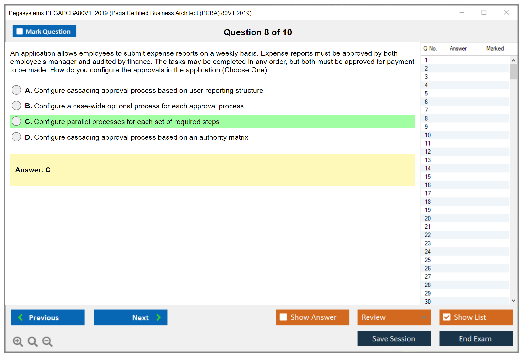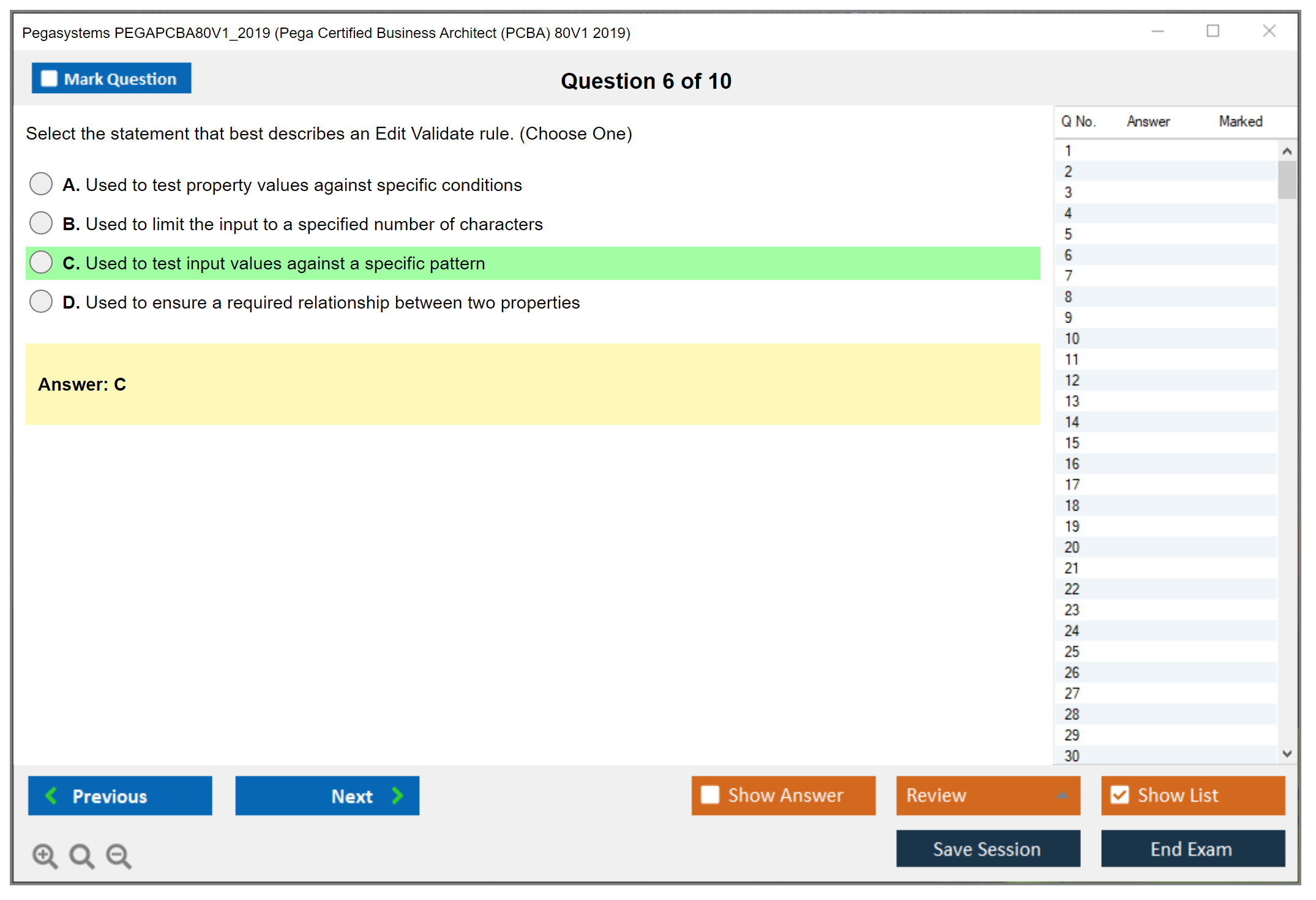 The Pegasystems PEGAPCBA80V1_2019 (Pega Certified Business Architect (PCBA) 80V1 2019) Exam is designed to validate the skills and knowledge of individuals in the role of a Pega Business Architect. It assesses the ability to participate in the design and construction of a Pega application, including the ability to apply Pega's business and technical concepts and terminology.