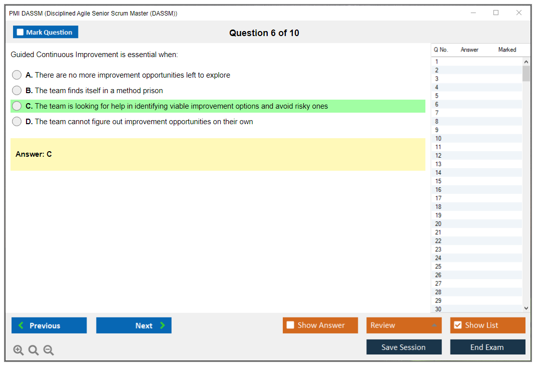The PMI DASSM Exam is designed to assess the knowledge and skills of experienced Agile practitioners in leading and managing Agile teams and projects. It focuses on advanced Agile concepts and practices, including the use of the Disciplined Agile toolkit.