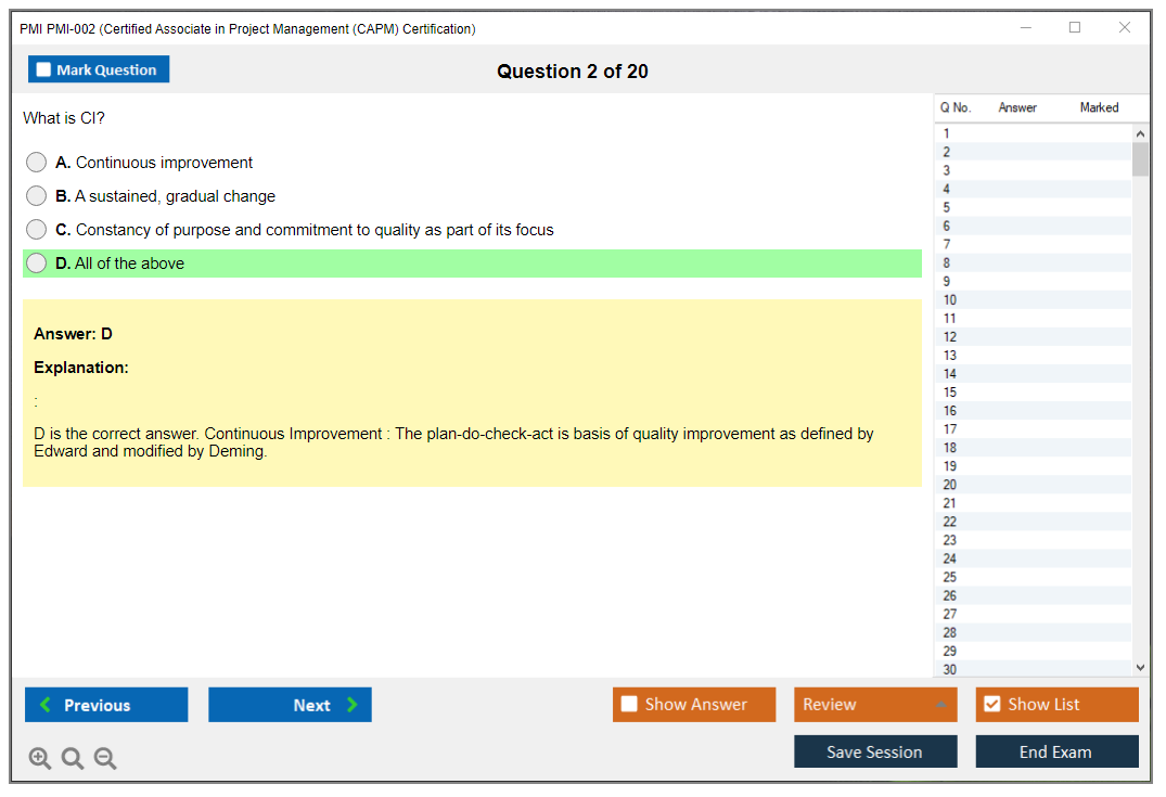 The PMI PMI-002 (Certified Associate in Project Management, CAPM) Certification Exam is designed for individuals who want to demonstrate their understanding of fundamental project management knowledge, terminology, and processes. It is an entry-level certification offered by the Project Management Institute (PMI).