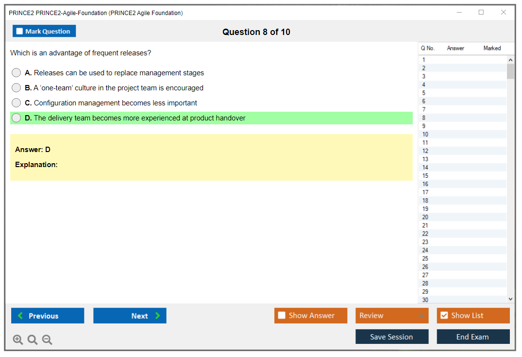The question format of the PRINCE2 Agile Foundation Exam is multiple-choice.