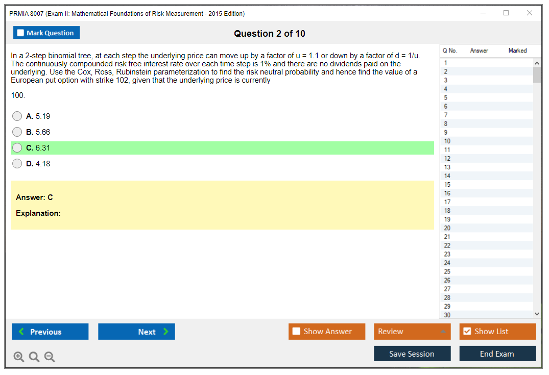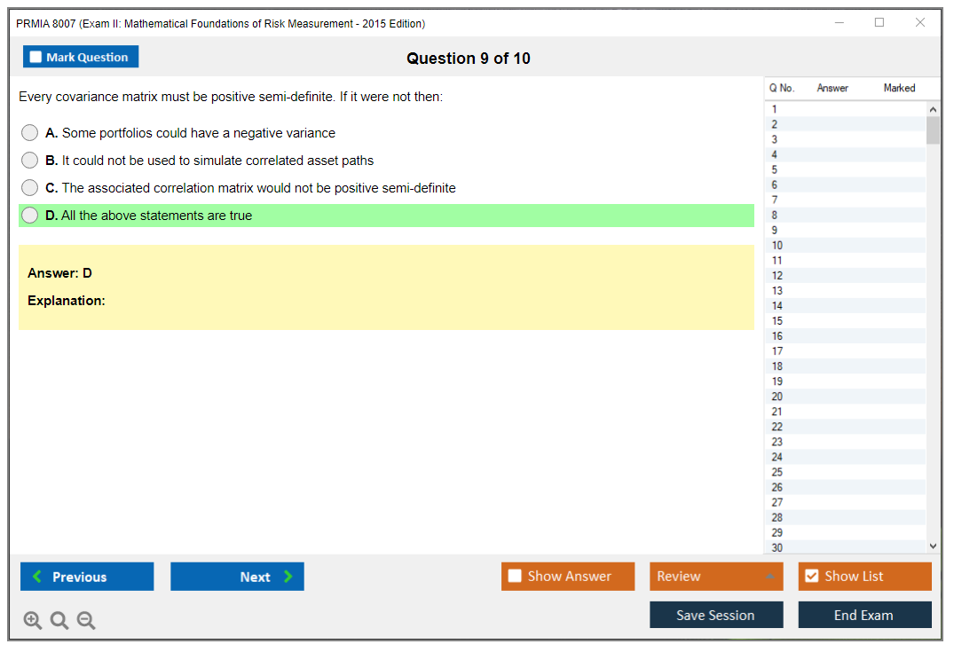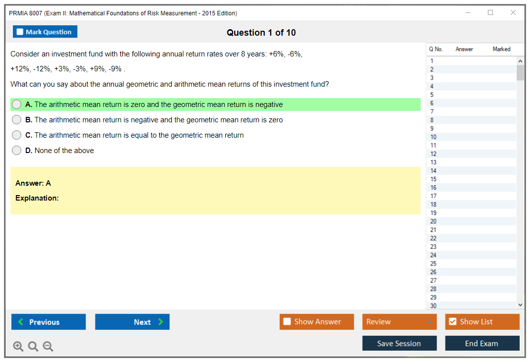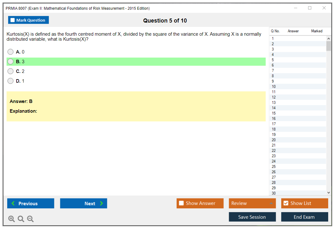 The PRMIA 8007 (Exam II: Mathematical Foundations of Risk Measurement - 2015 Edition) is a specialized exam designed to assess the mathematical skills and knowledge necessary for risk measurement in the financial industry. It forms part of the Professional Risk Manager (PRM) certification program.