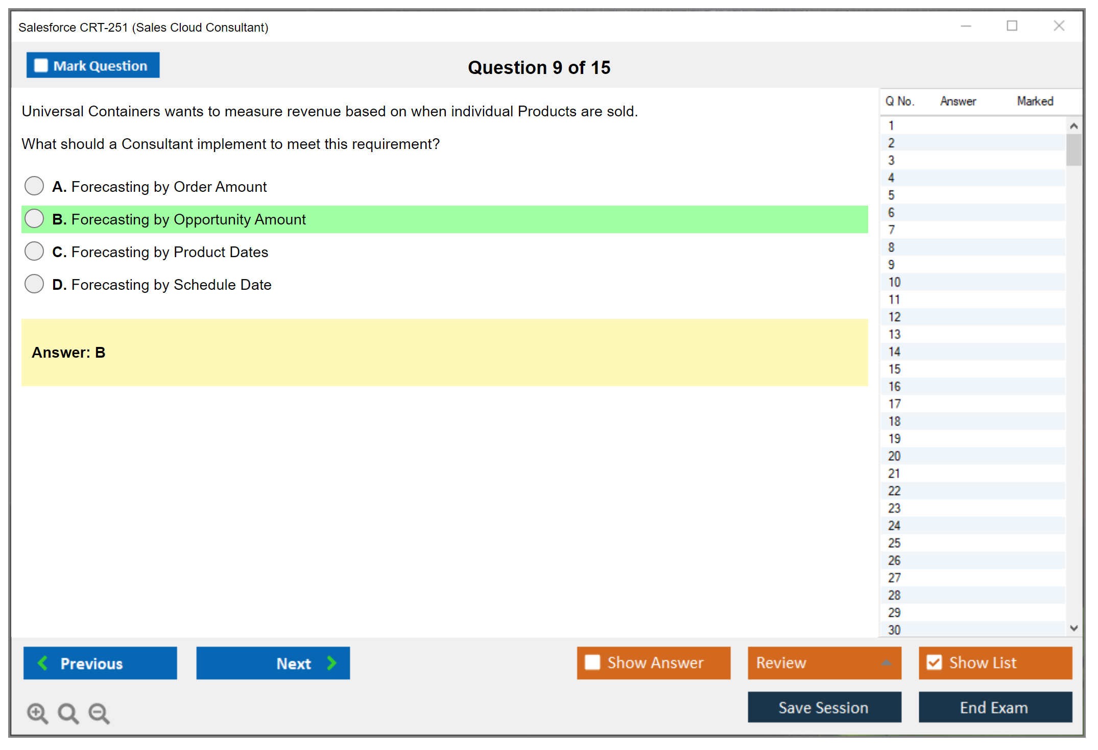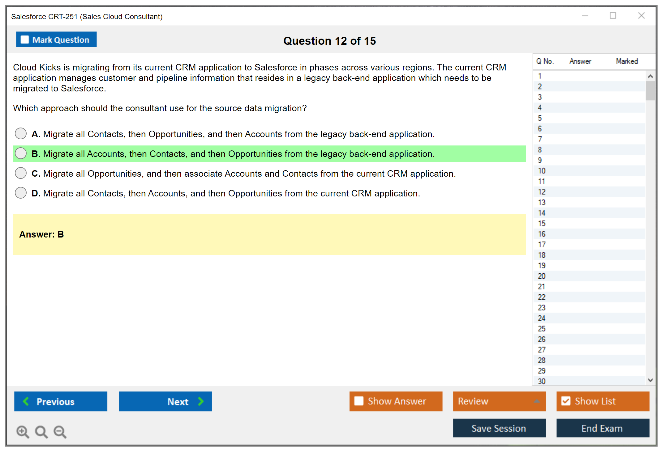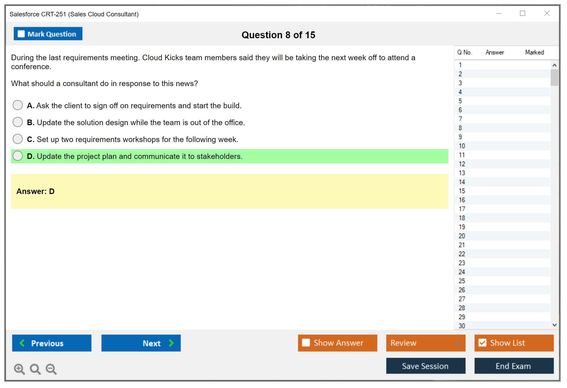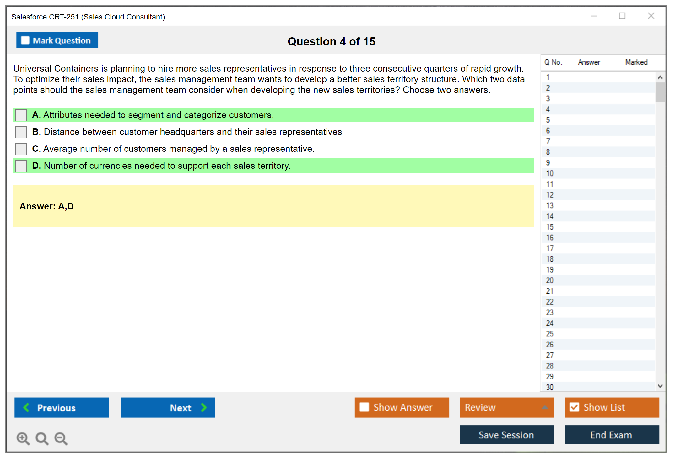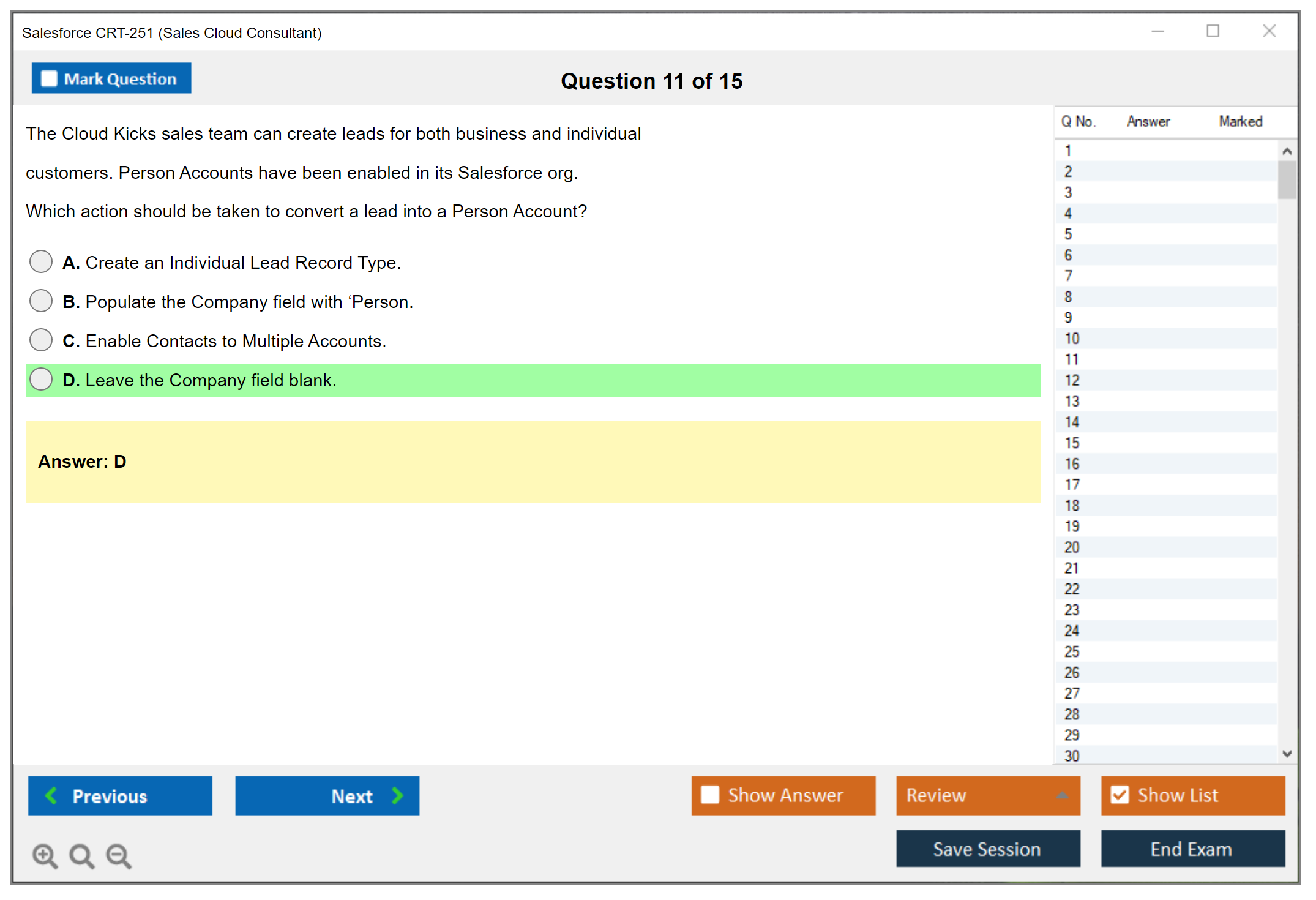 The Salesforce CRT-251 (Salesforce Certified Sales Cloud Consultant (SP24)) exam is designed for professionals who have experience implementing Sales Cloud solutions in a customer-facing role. It tests the candidate's ability to design and implement Sales Cloud solutions that meet customer business requirements and are maintainable and scalable.