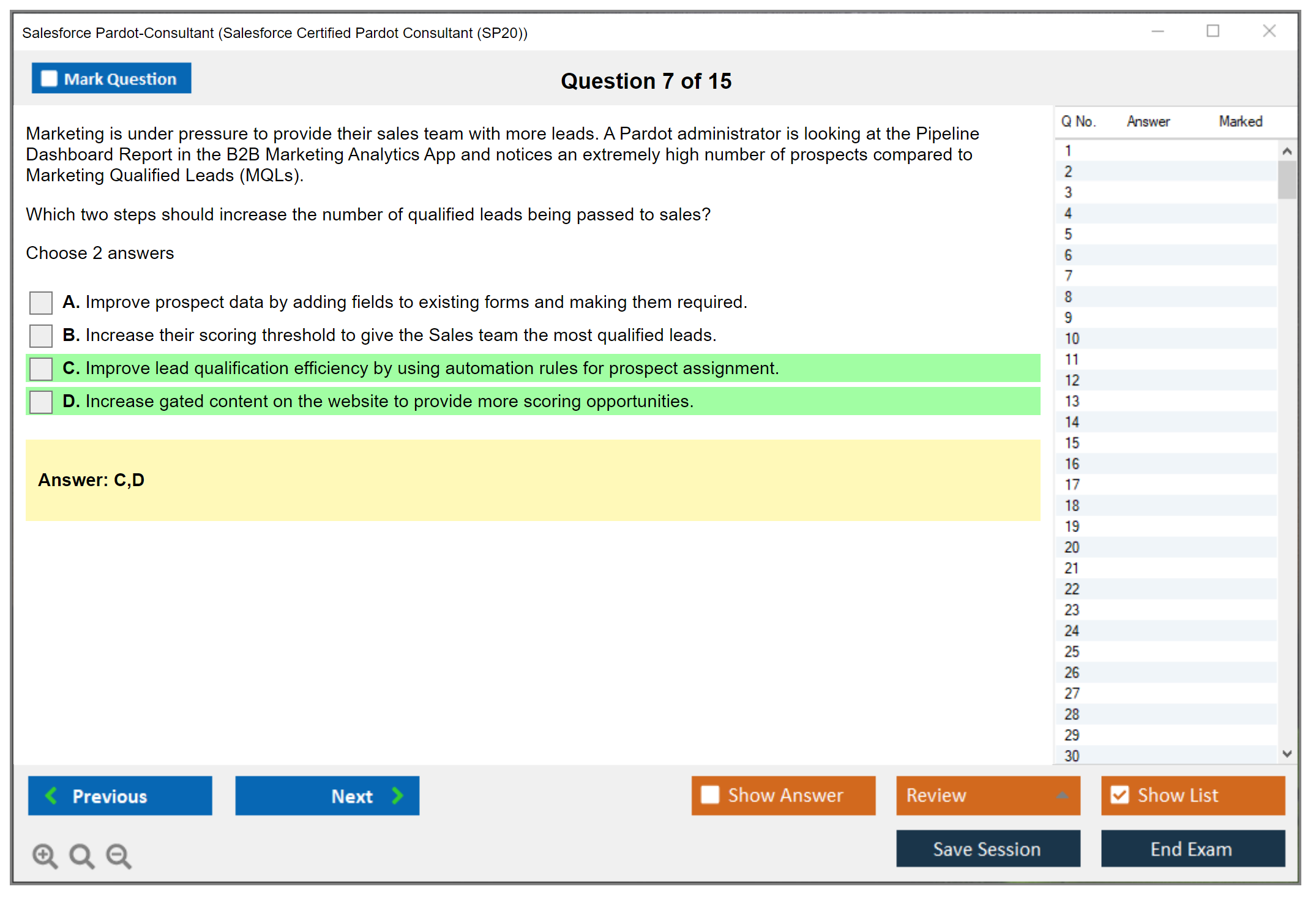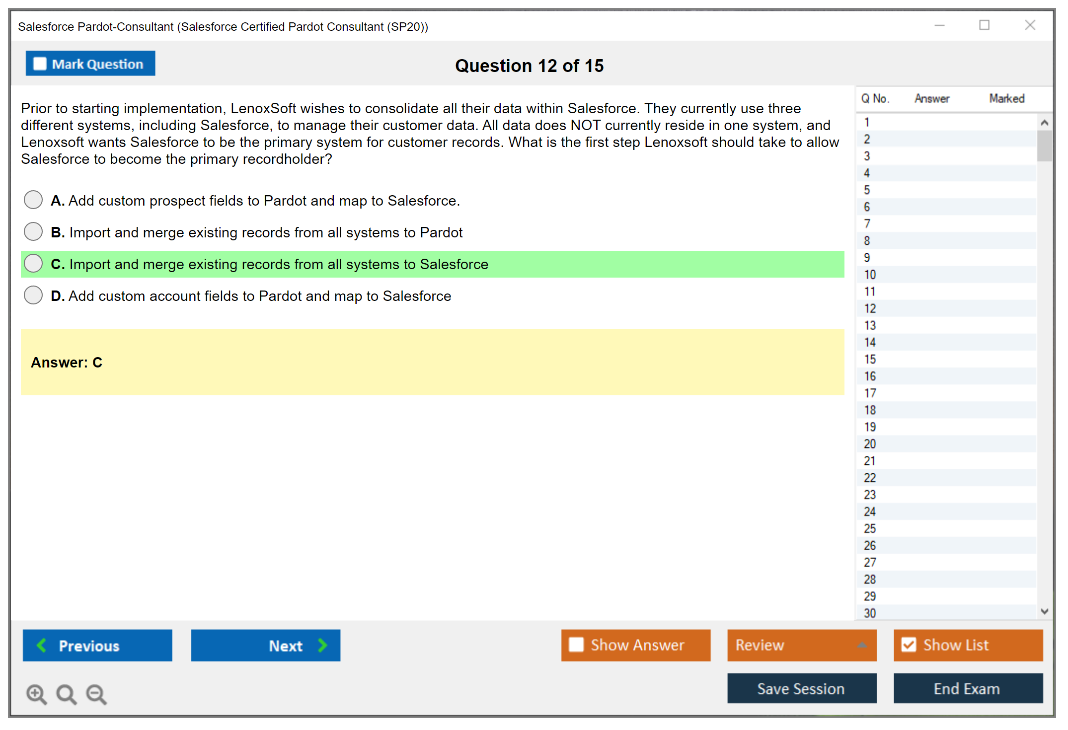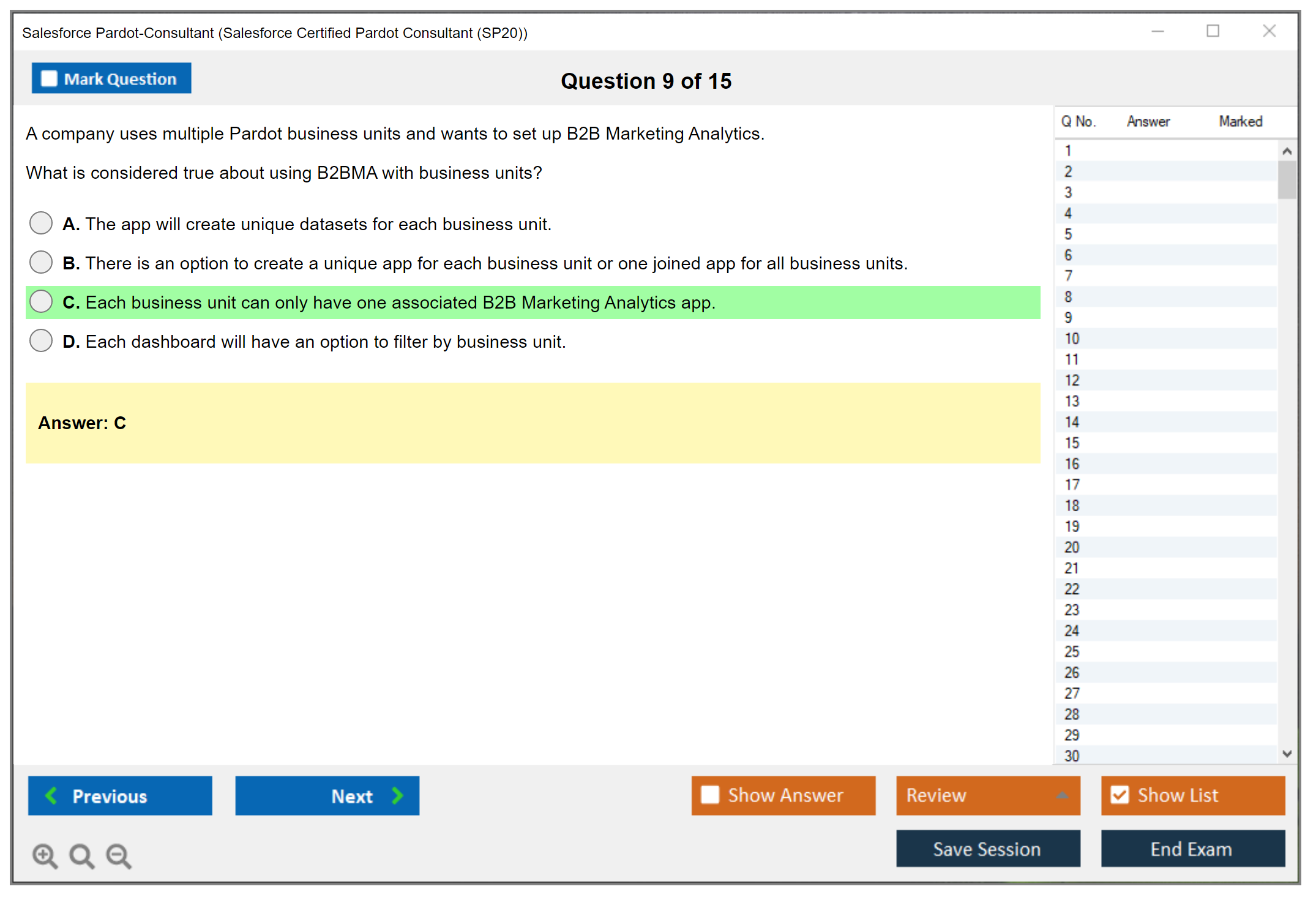 The Salesforce Pardot-Consultant Exam is a certification test for professionals specializing in Salesforce's Pardot platform. It assesses the candidate's ability to understand and apply Pardot's features to optimize marketing and sales workflows.