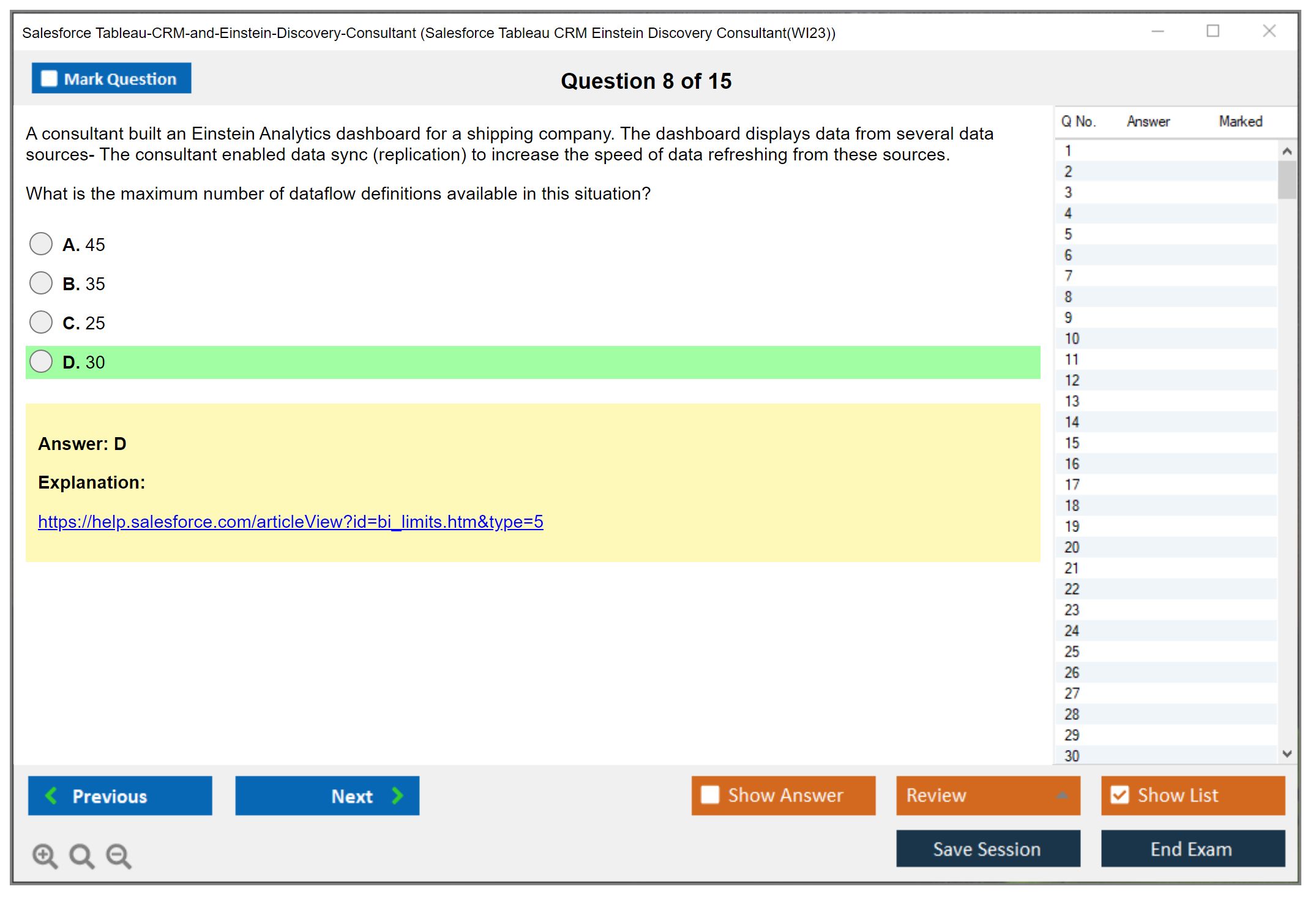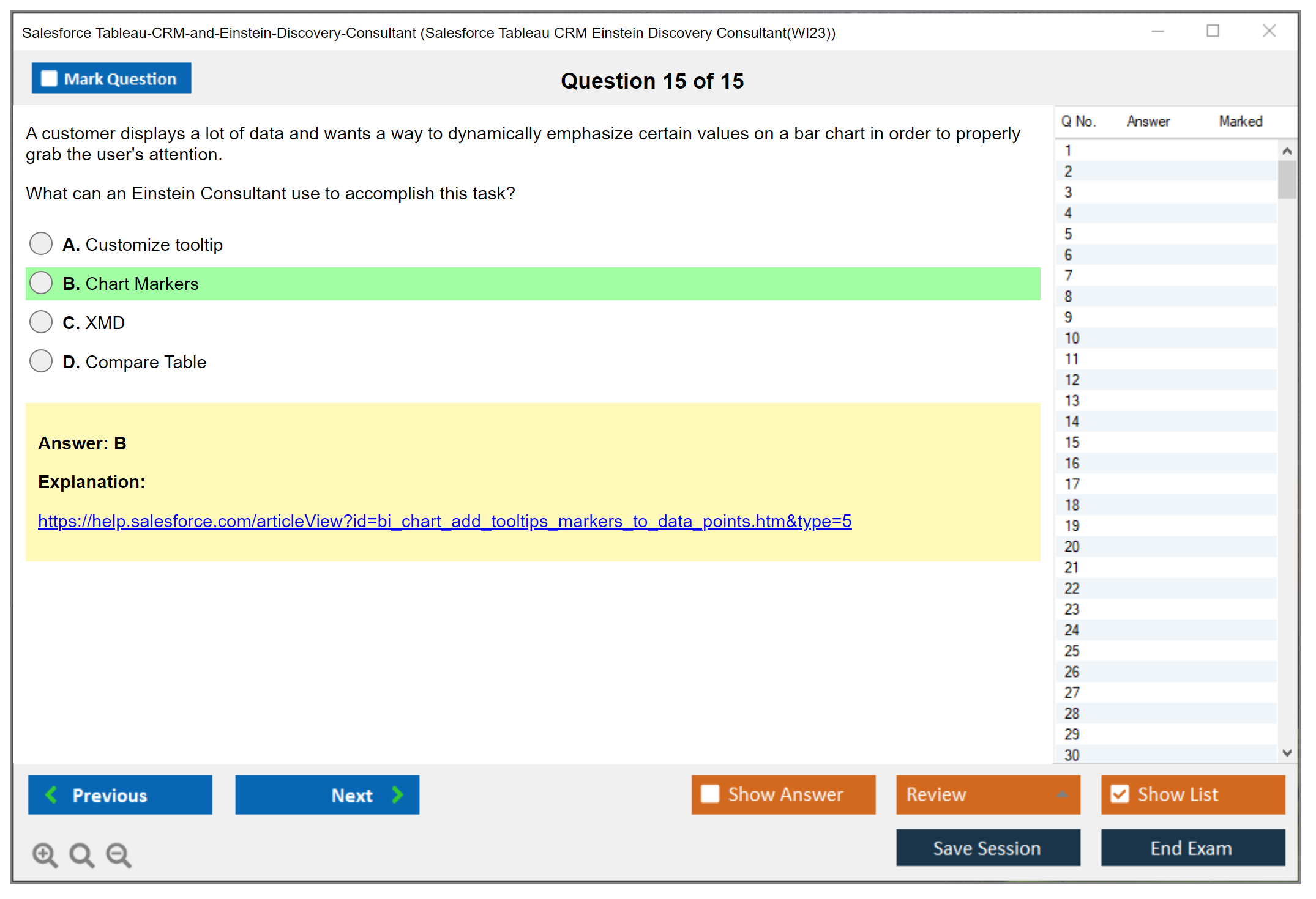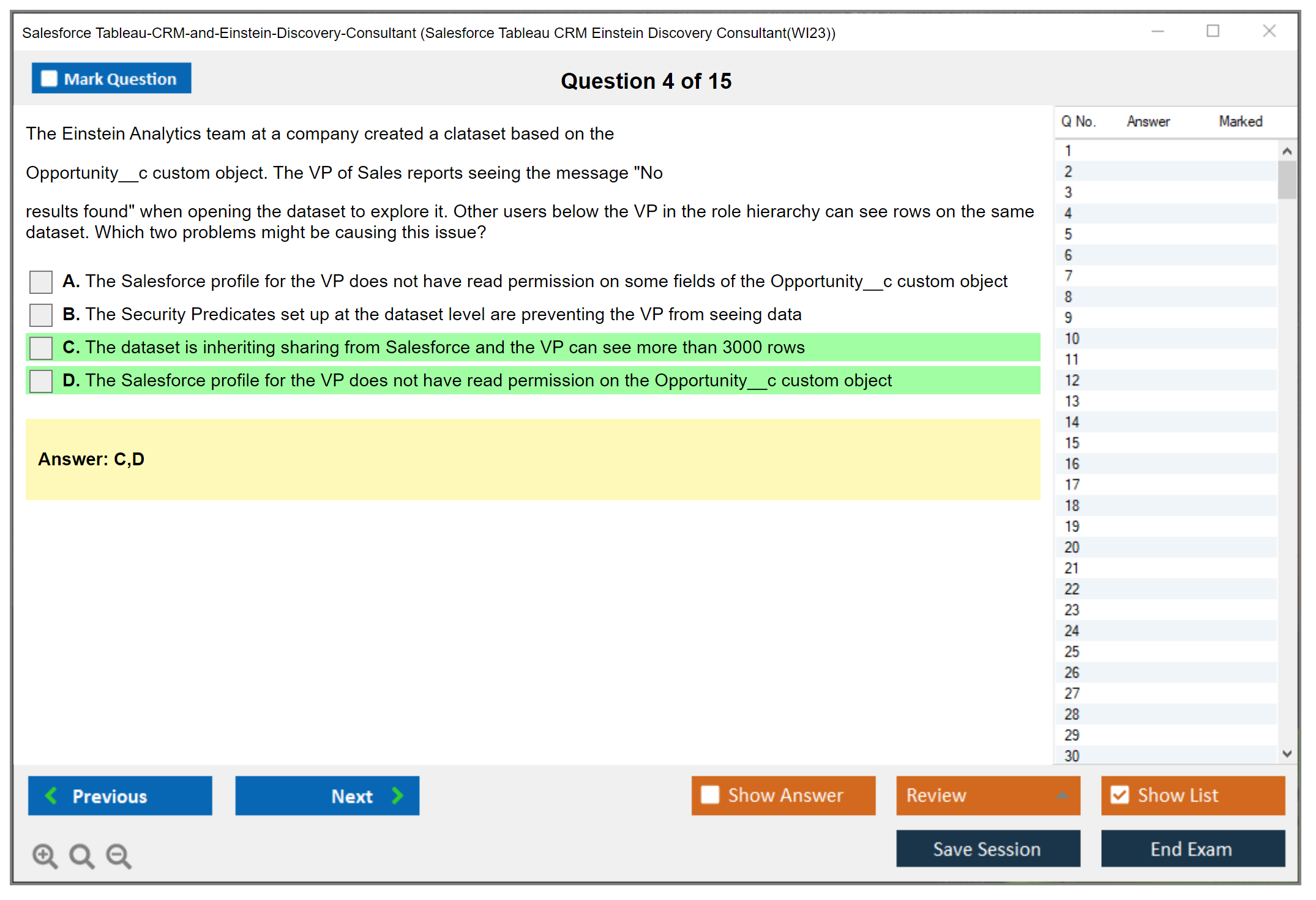 Sample questions for the Salesforce Tableau CRM and Einstein Discovery Consultant exam can be found on the official Salesforce certification website or through various online certification preparation resources.