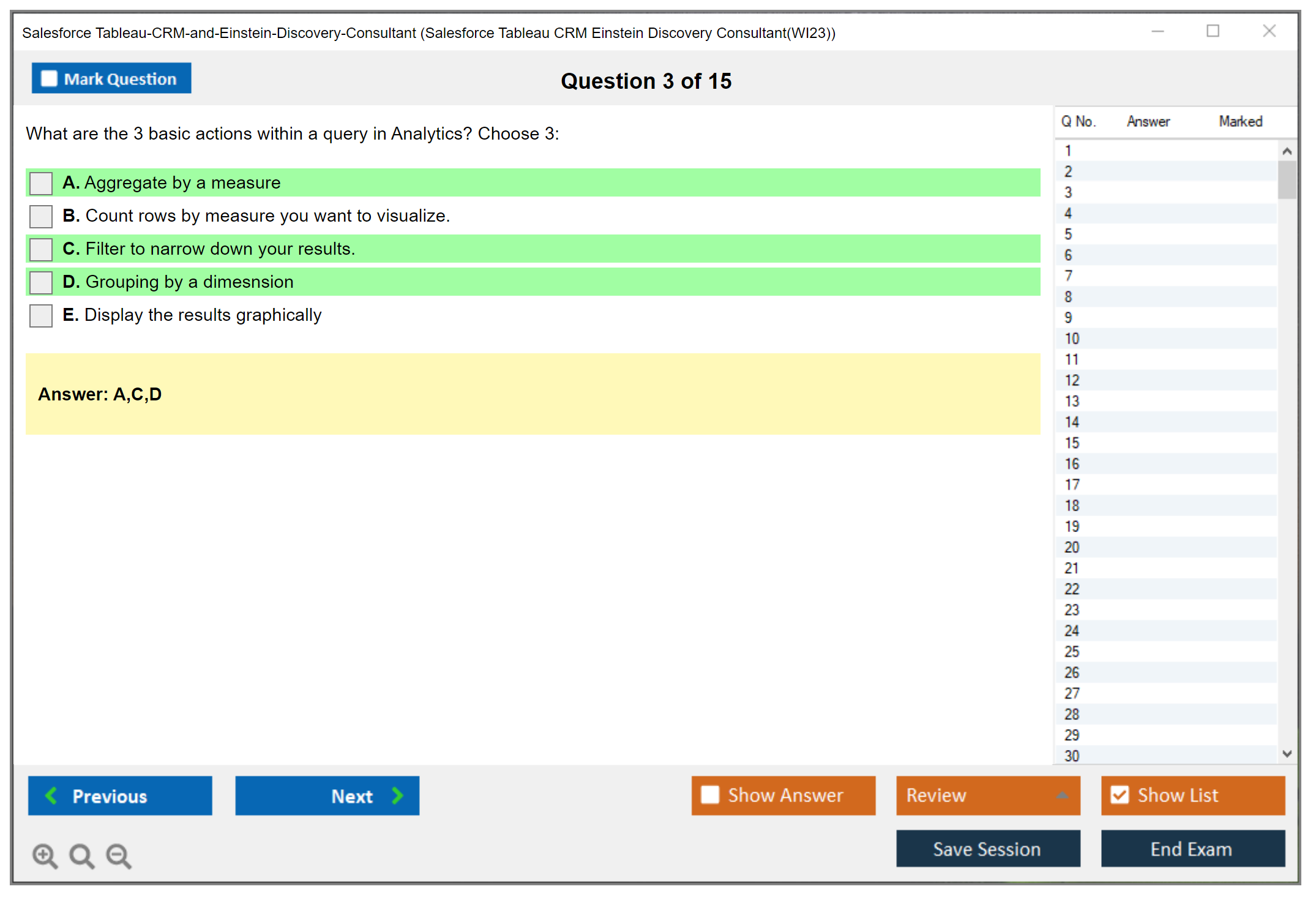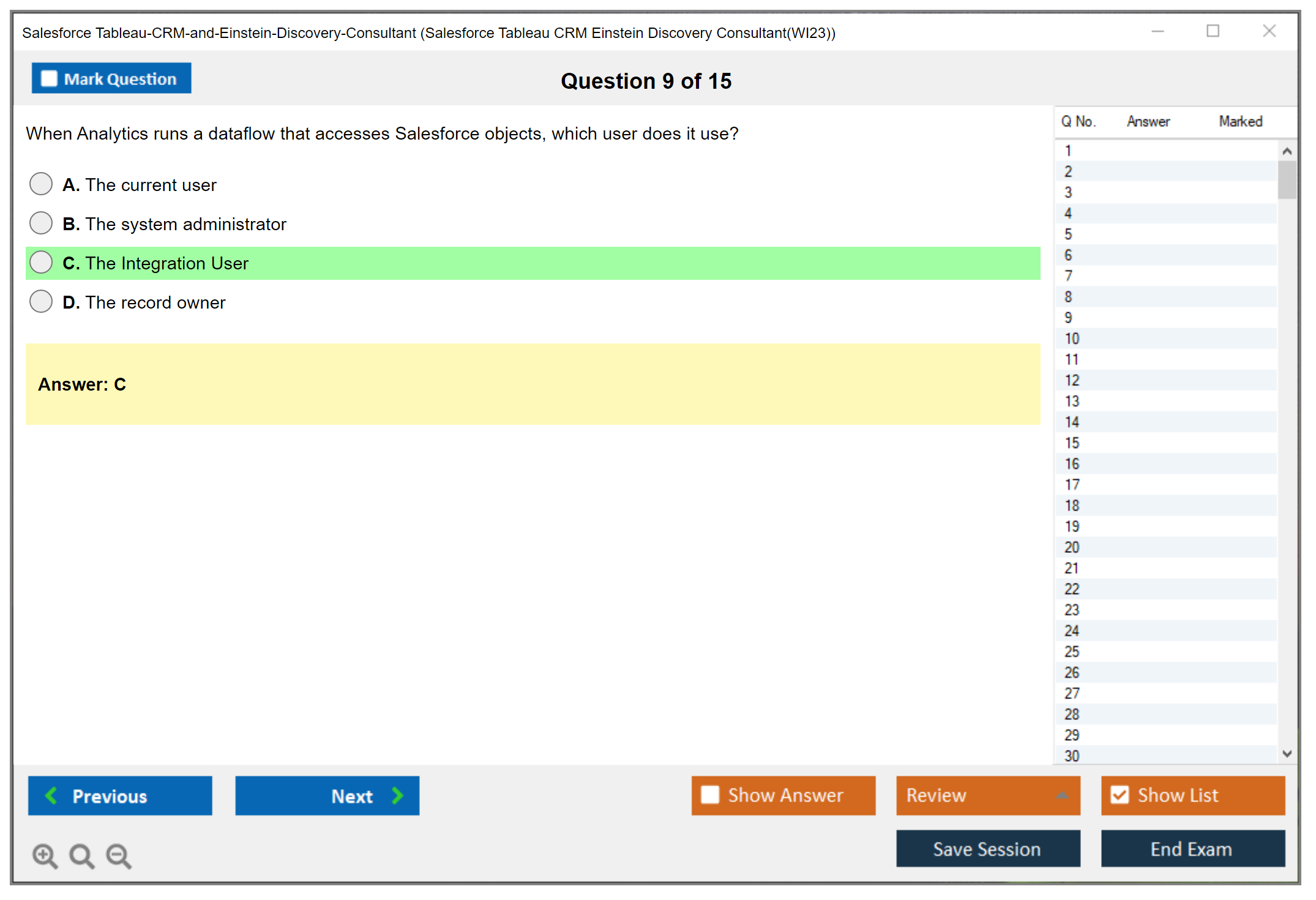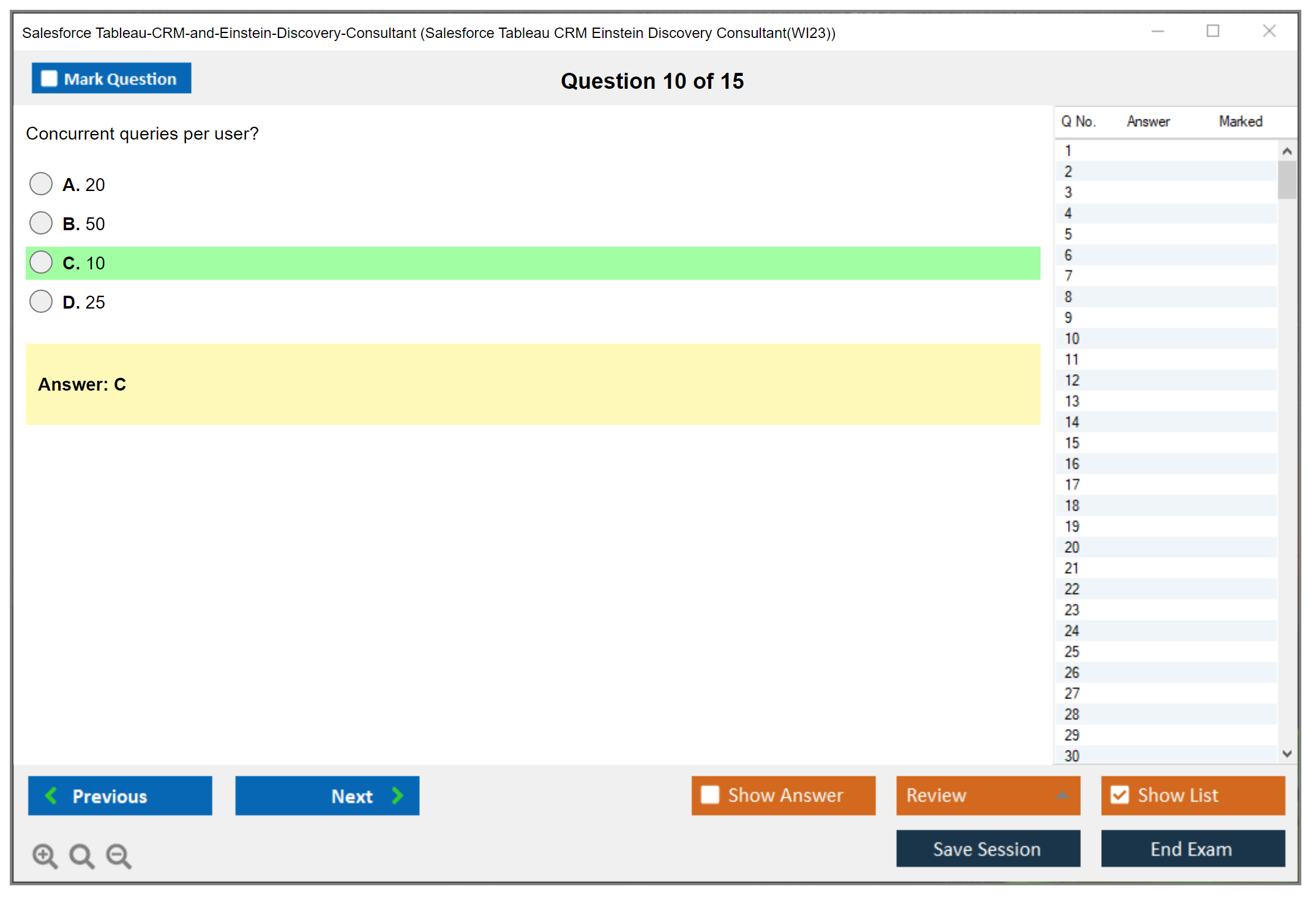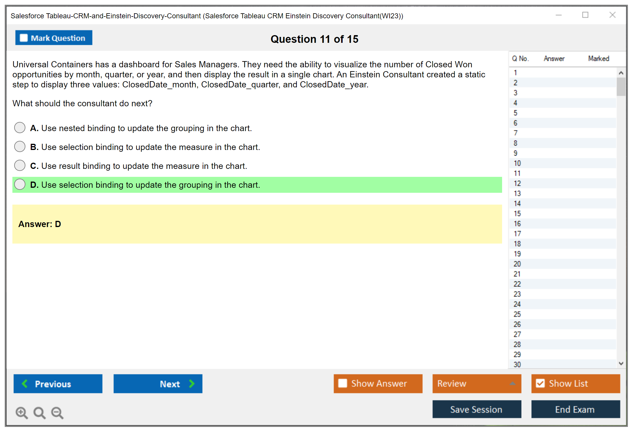 Sample questions for the Salesforce Tableau CRM and Einstein Discovery Consultant exam can be found on the official Salesforce certification website or through various online certification preparation resources.