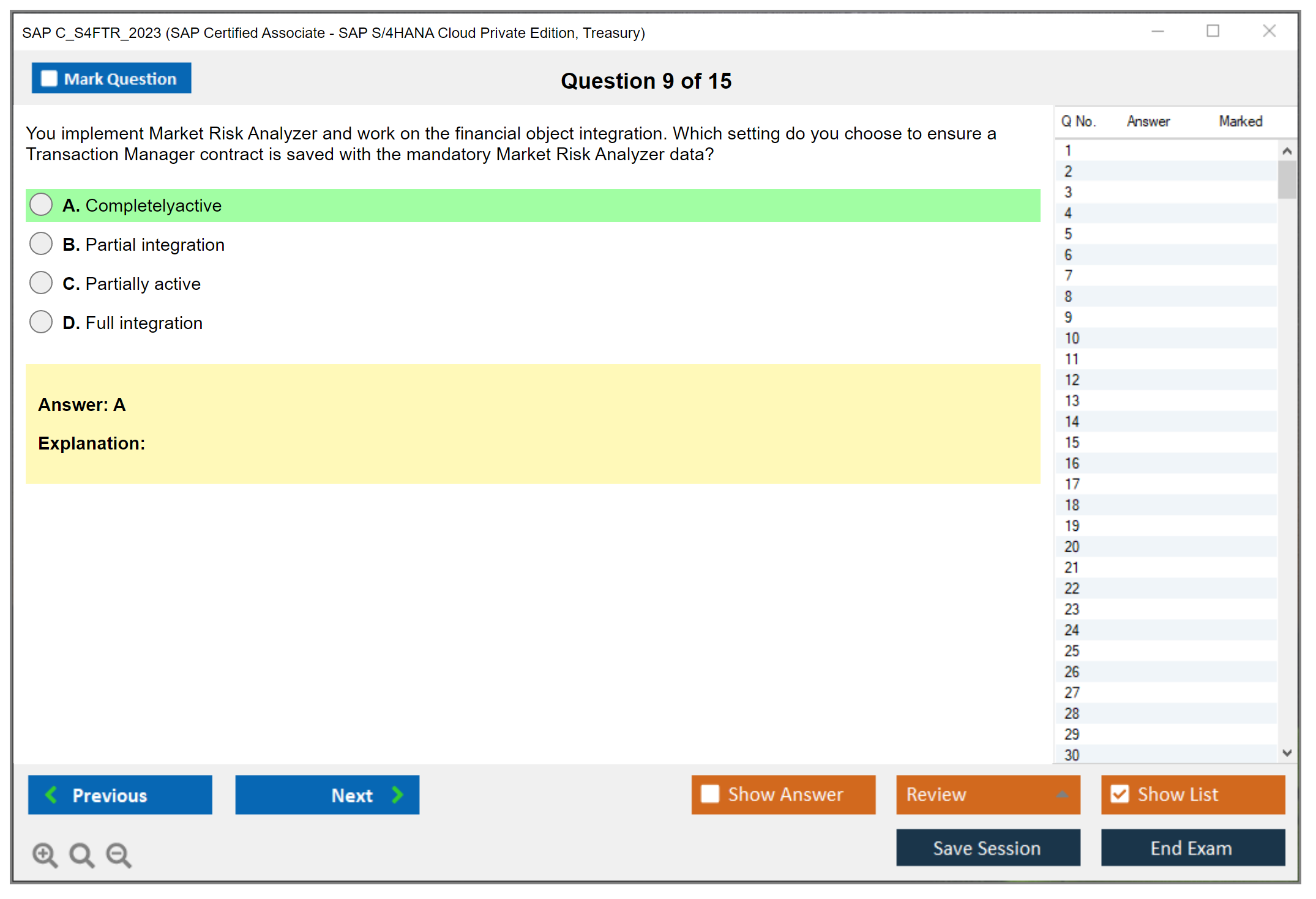 The SAP C_S4FTR_2023 exam is a certification test for the SAP S/4HANA Cloud Private Edition, Treasury module. It assesses the candidate's ability to apply their knowledge in practical scenarios and ensures they are proficient in using SAP's treasury functionalities.