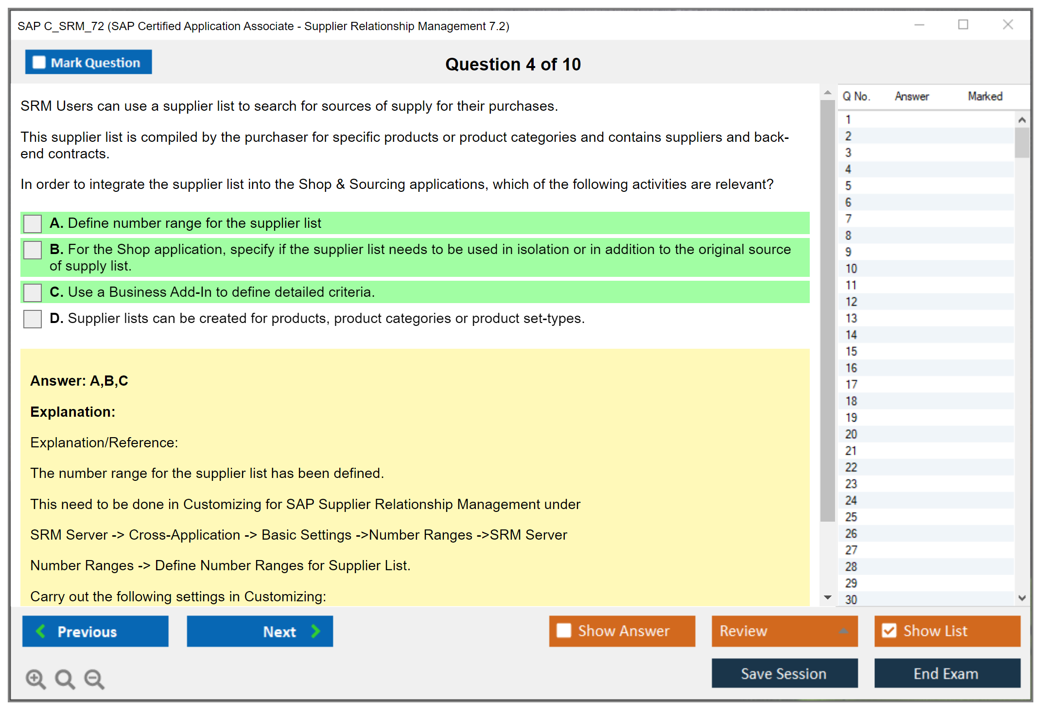 The SAP C_SRM_72 (SAP Certified Application Associate - Supplier Relationship Management 7.2) exam validates that the candidate possesses the fundamental and core knowledge required of the SAP SRM Consultant profile. This certification proves that the candidate has an overall understanding and in-depth technical skills to participate as a member of a project team in a mentored role.