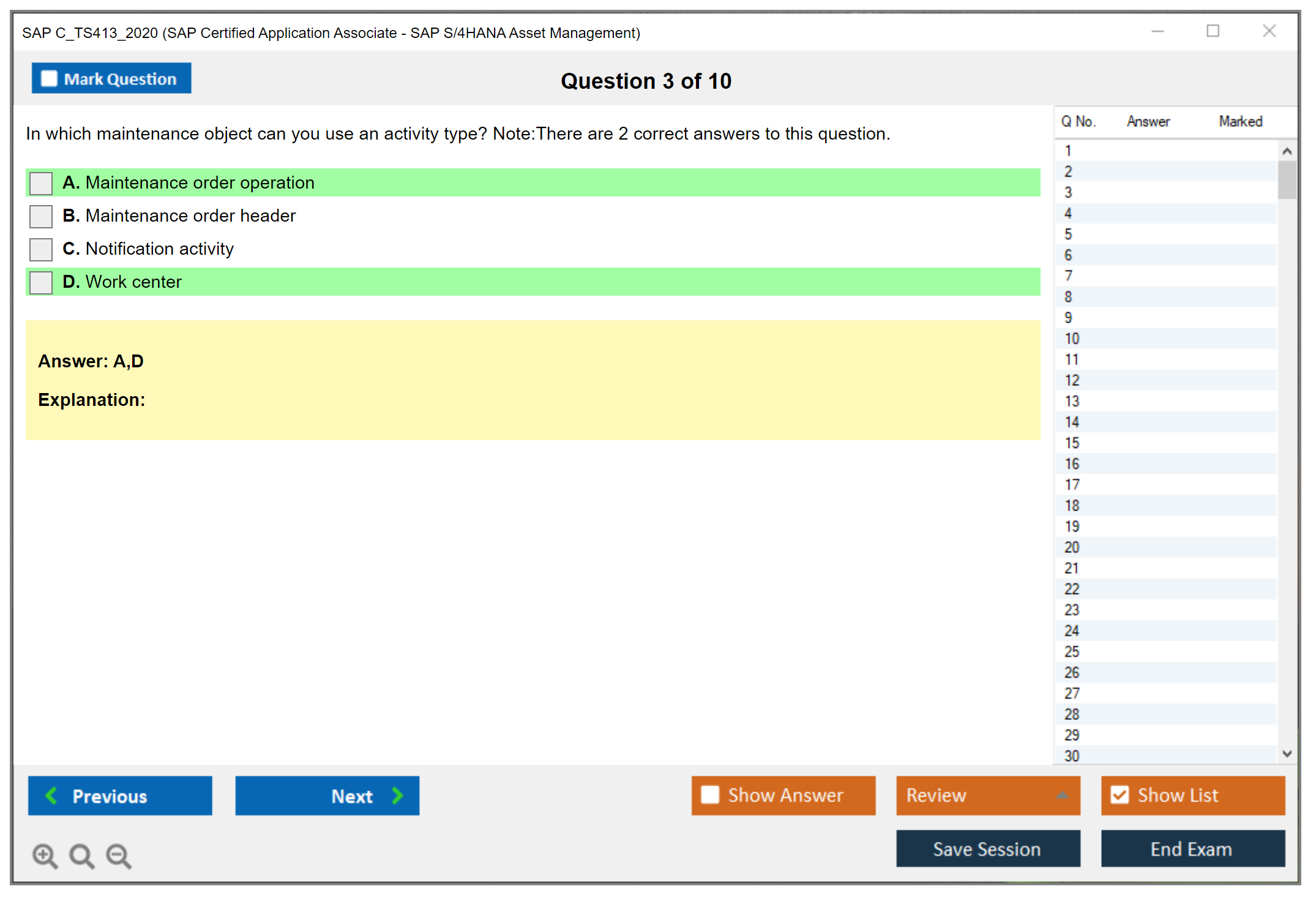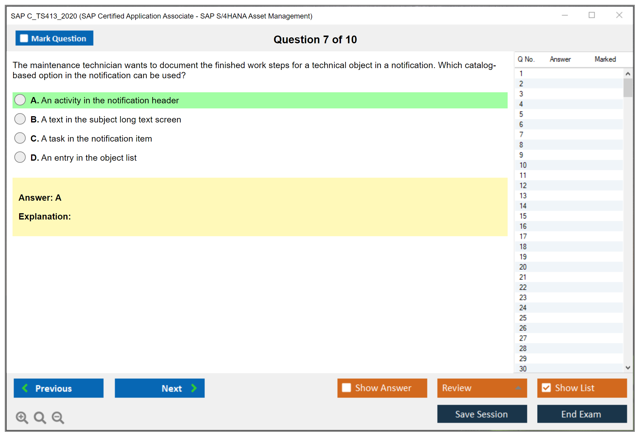 The SAP C_TS413_2020 exam, also known as SAP Certified Application Associate - SAP S/4HANA Asset Management, is designed to validate the candidate's knowledge and skills in the area of SAP S/4HANA Asset Management. This certification proves that the candidate has a fundamental understanding and in-depth technical skills to participate as a member of a project team in a mentored role.
