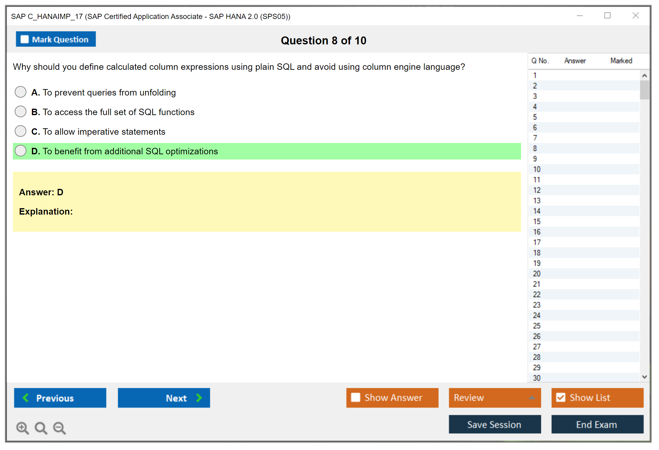 The SAP C_HANAIMP_17 exam is designed to validate the skills and knowledge of candidates in the area of SAP HANA 2.0 (SPS05). It is intended for application associates who are responsible for implementing and modeling SAP HANA. The certification demonstrates a candidate's ability to work effectively with SAP HANA, covering various aspects such as data provisioning, modeling, and optimization.