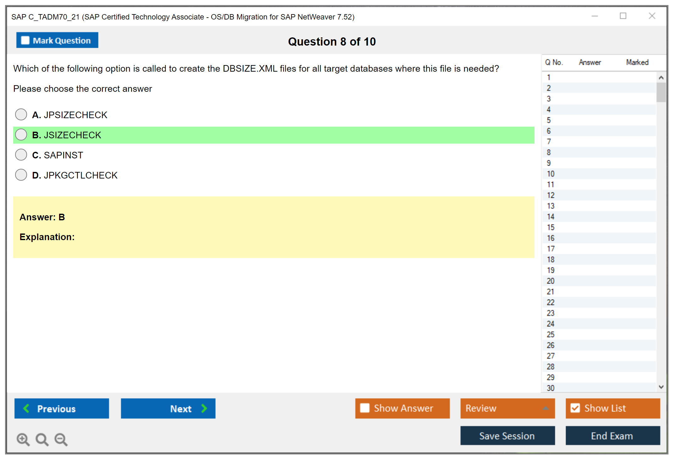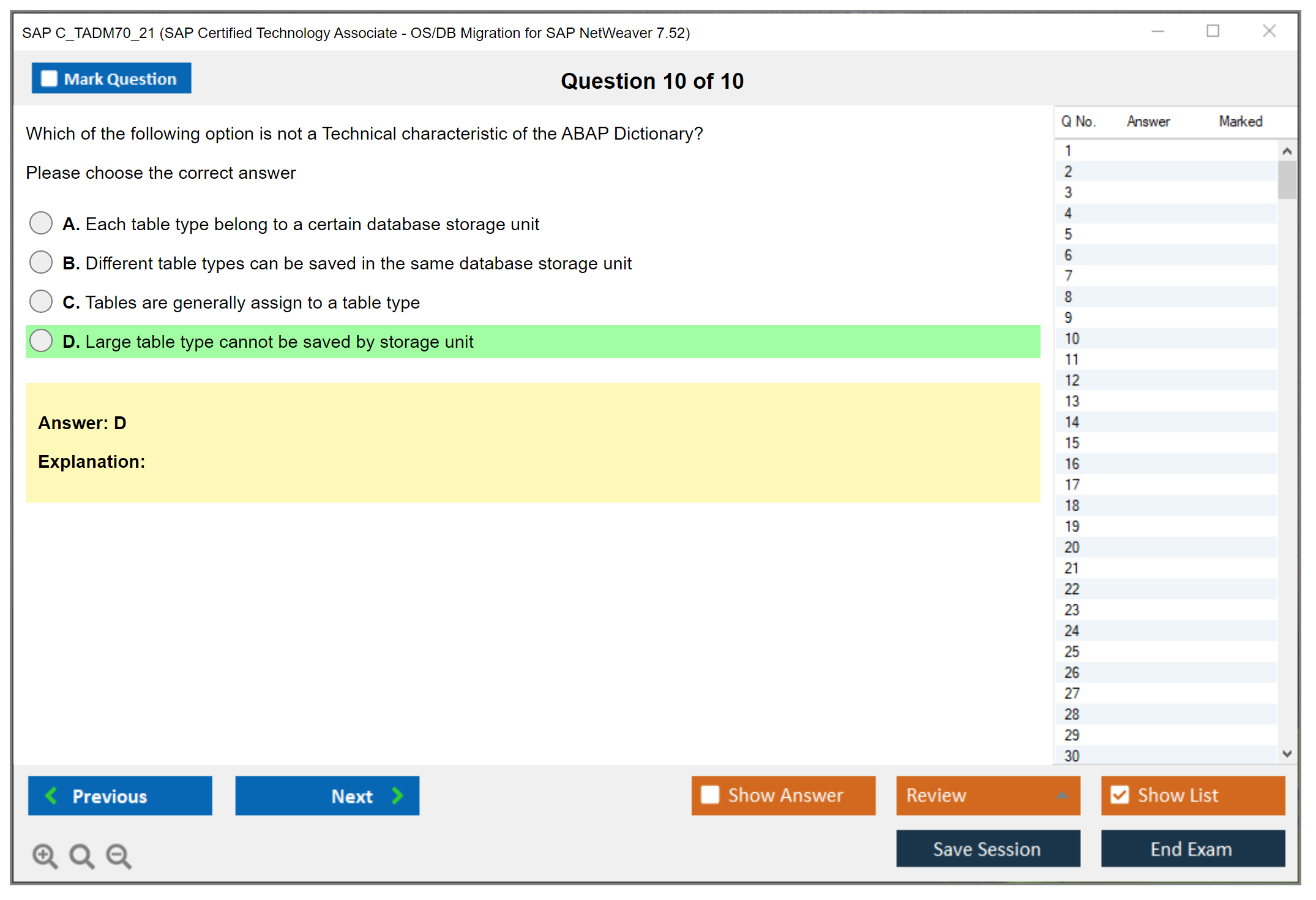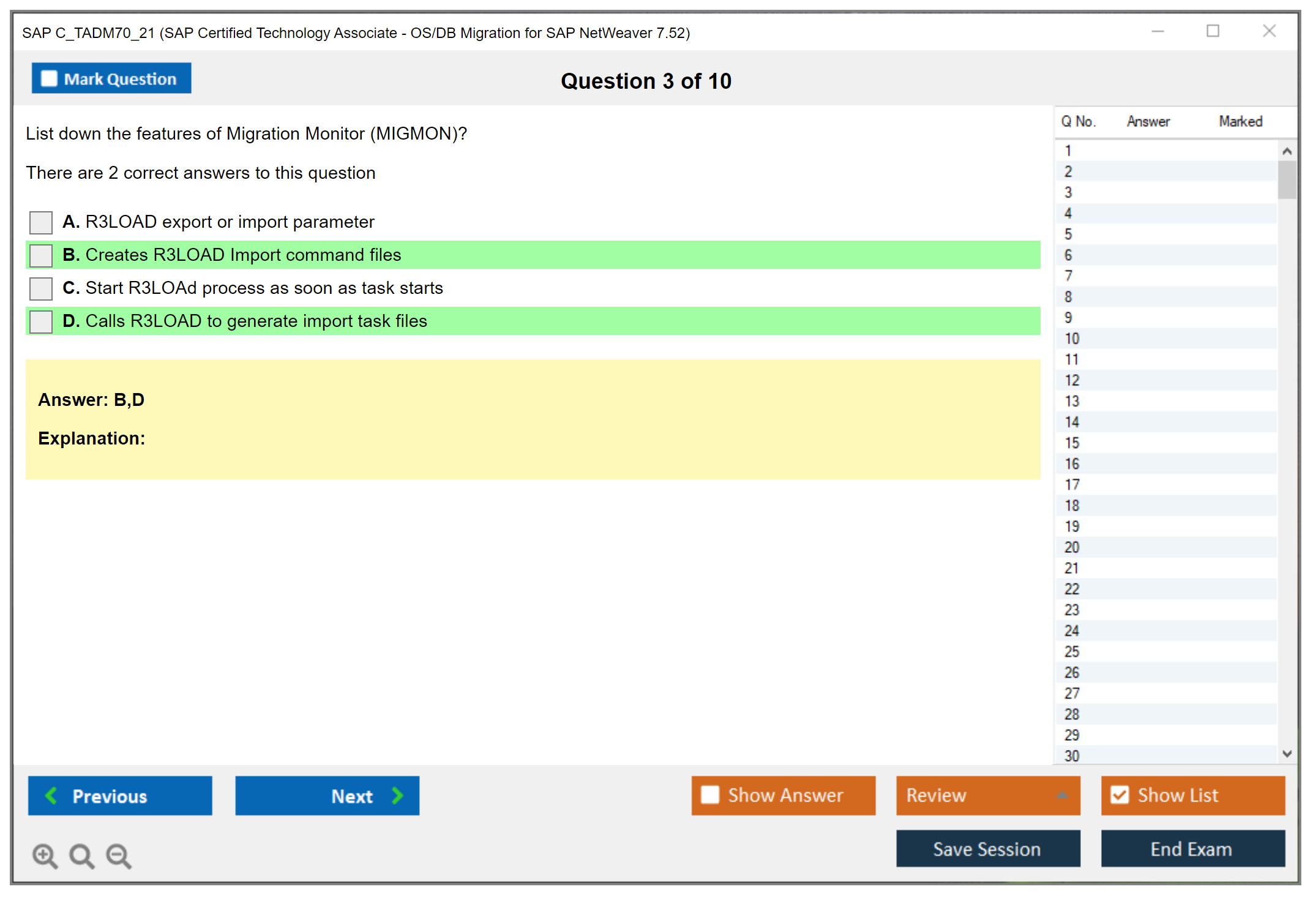 The SAP C_TADM70_21 exam is designed to assess the candidate's ability to handle the technical requirements and operations of SAP systems, focusing on OS/DB migration for SAP NetWeaver 7.52. It is aimed at ensuring that the candidate is well-versed with the necessary skills and knowledge for successful migration tasks.