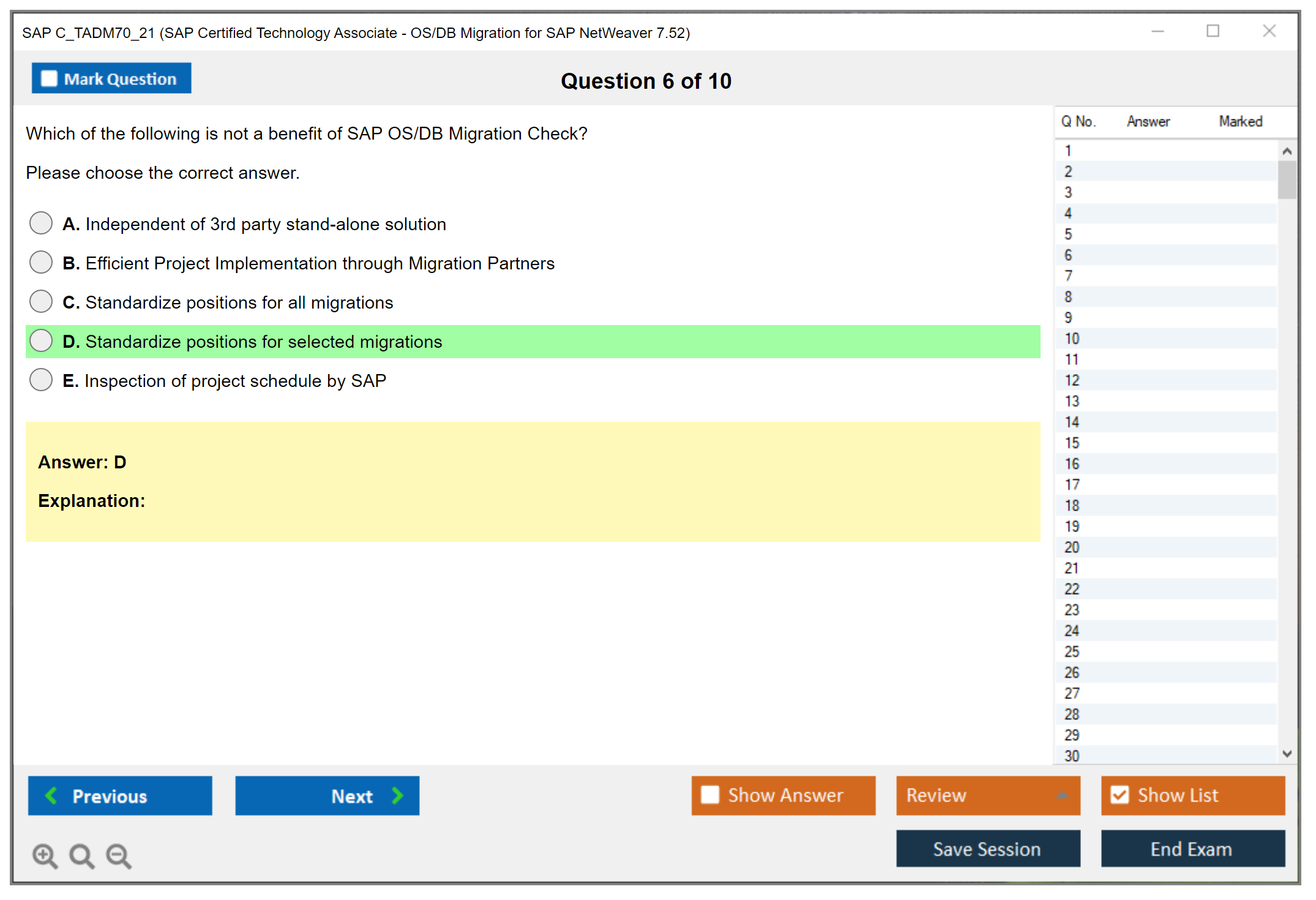 The SAP C_TADM70_21 (SAP Certified Technology Associate - OS/DB Migration for SAP NetWeaver 7.52) exam validates that the candidate possesses the fundamental knowledge and proven skills in the area of SAP system administration and OS/DB migration for SAP NetWeaver 7.52.