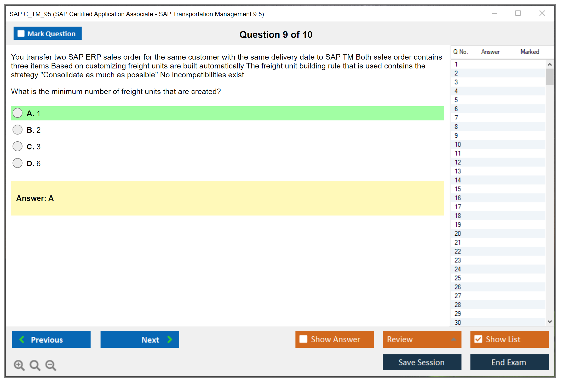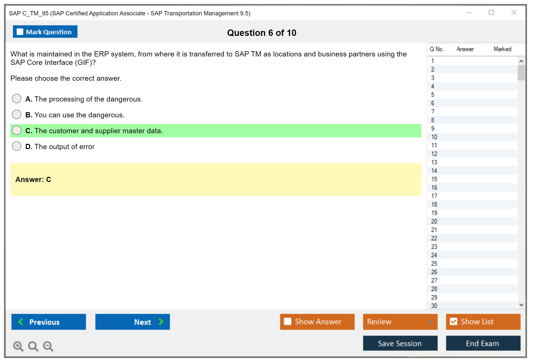 The SAP C_TM_95 (SAP Certified Application Associate - SAP Transportation Management 9.5) Exam is designed to validate the candidate's knowledge and skills in the area of SAP Transportation Management. This certification proves that the candidate has a basic understanding of the solution and can implement it in projects under the guidance of an experienced consultant.