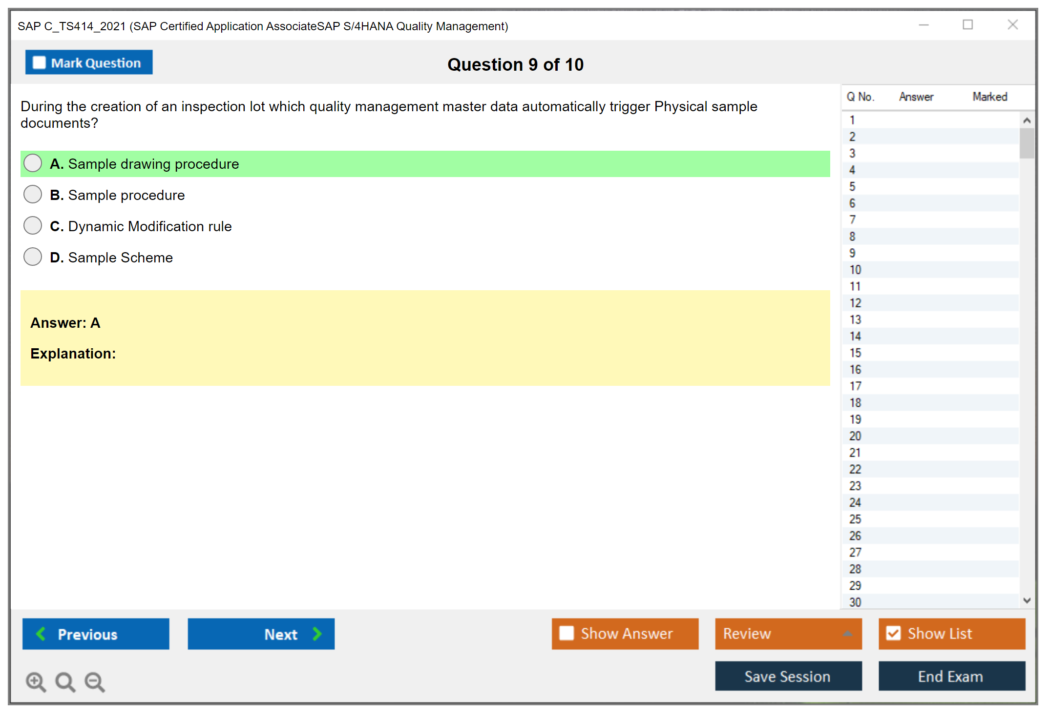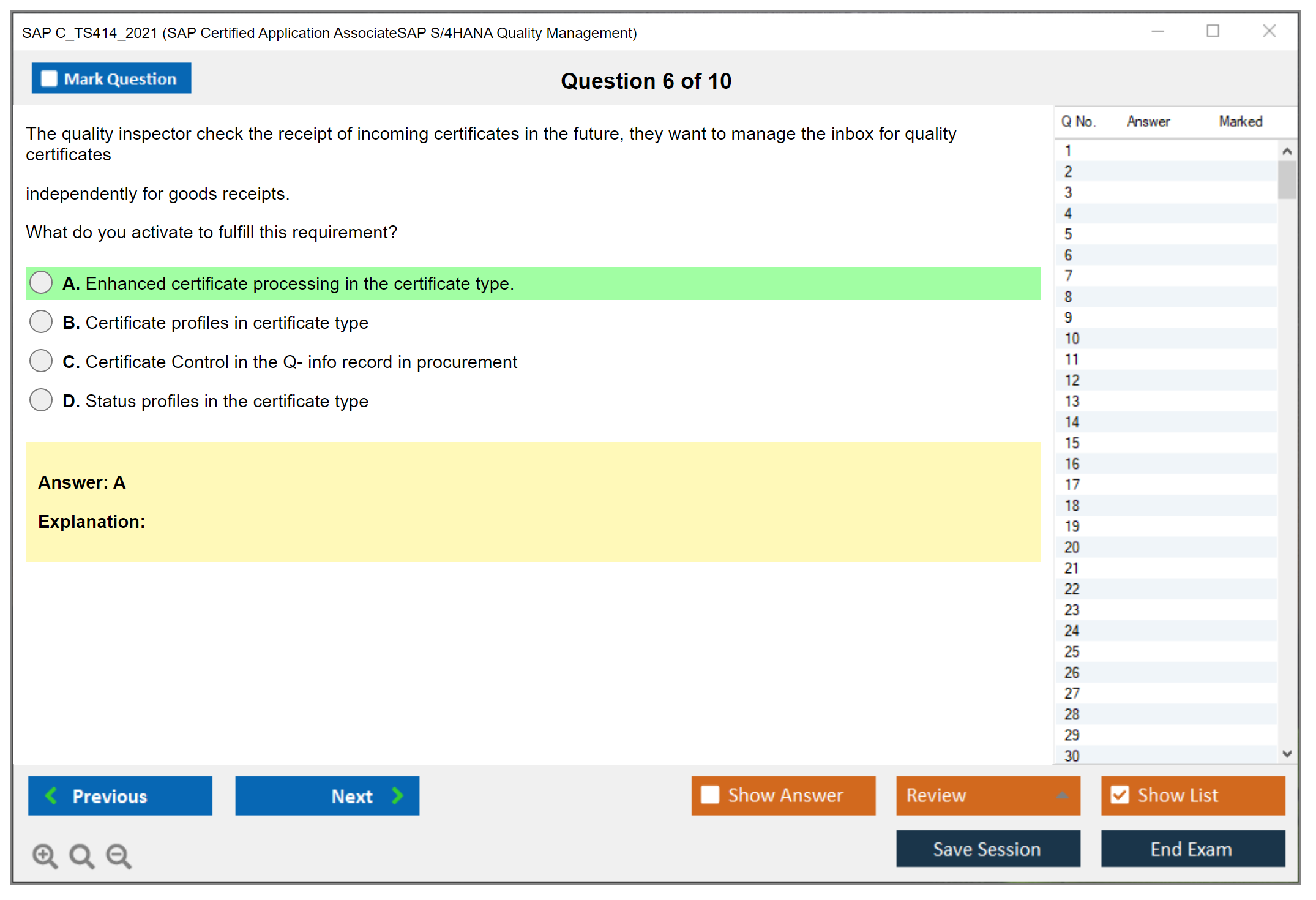The SAP C_TS414_2021 exam is an associate-level certification that focuses on validating the candidate's knowledge and skills in SAP S/4HANA Quality Management. It tests the candidate's ability to implement and manage quality management processes within the SAP S/4HANA environment.