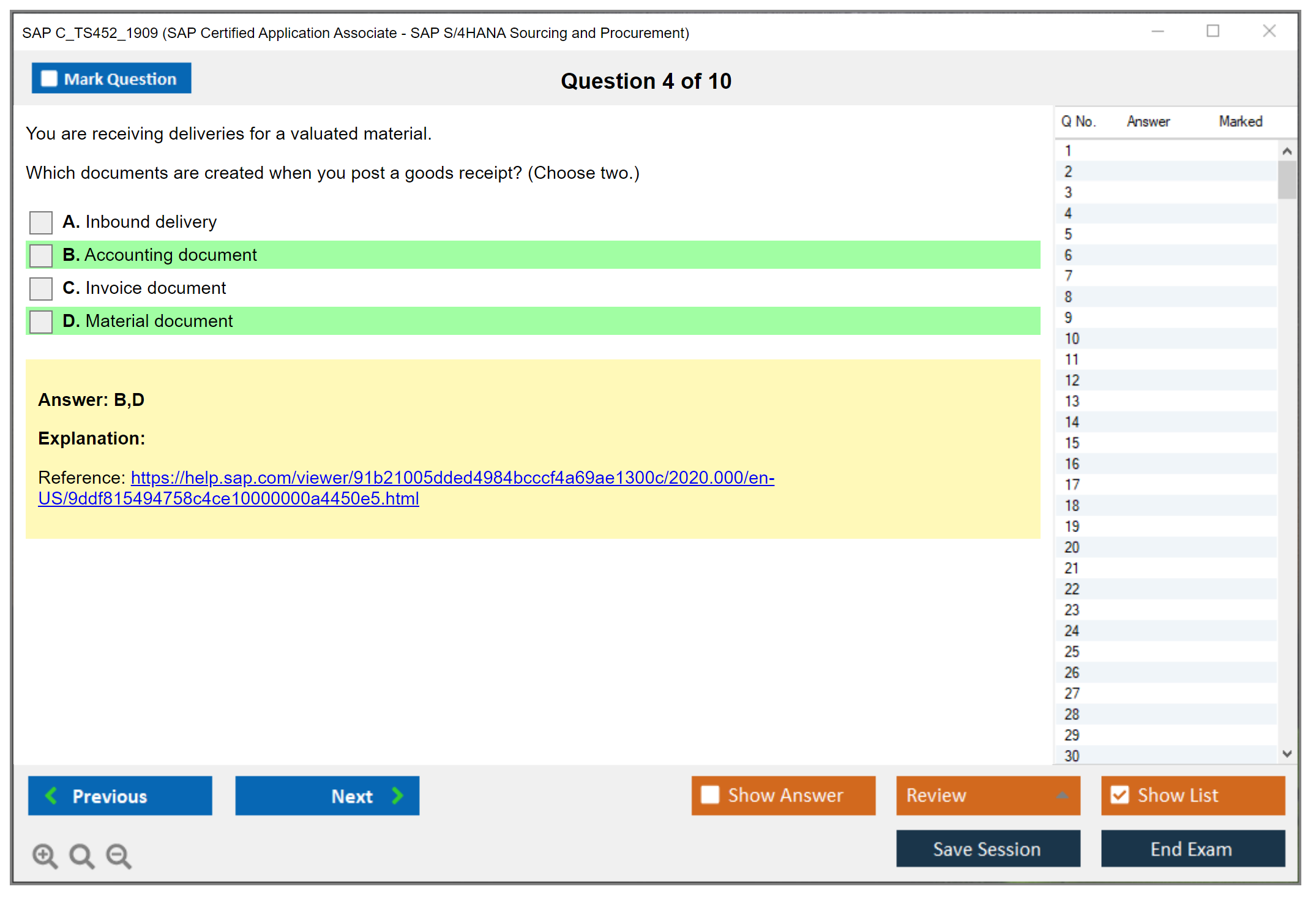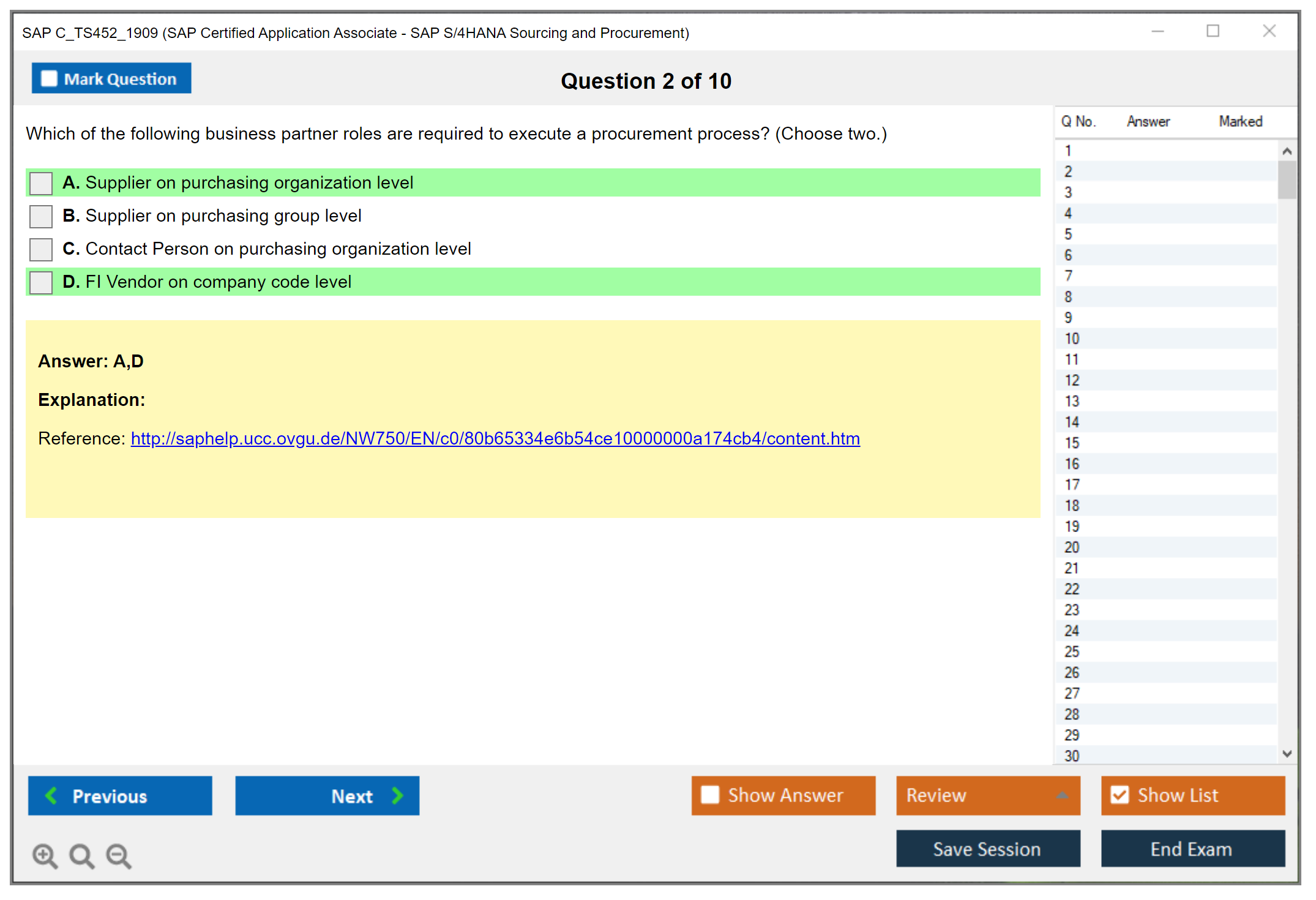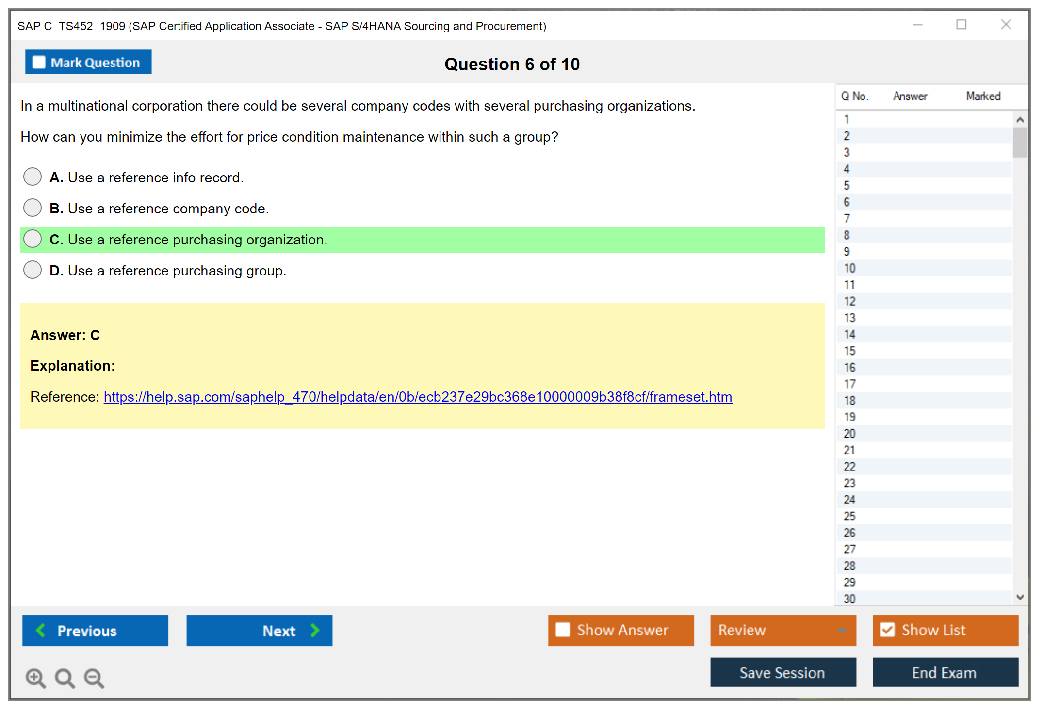 The SAP C_TS452_1909 exam, also known as SAP Certified Application Associate - SAP S/4HANA Sourcing and Procurement, is designed to validate the candidate's knowledge and skills in the area of SAP S/4HANA Sourcing and Procurement. This certification proves that the candidate has a fundamental understanding and in-depth technical skills to participate as a member of a project team in a mentored role.