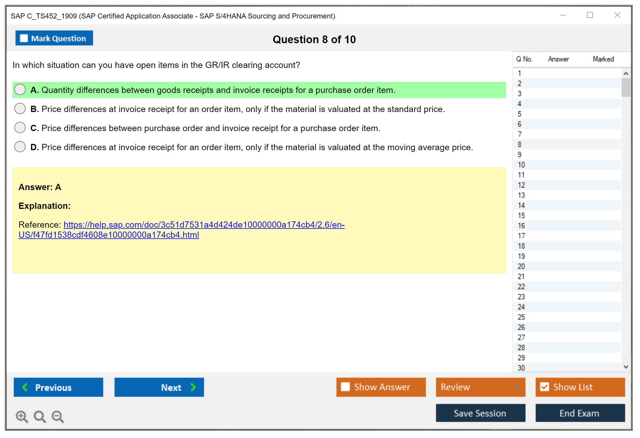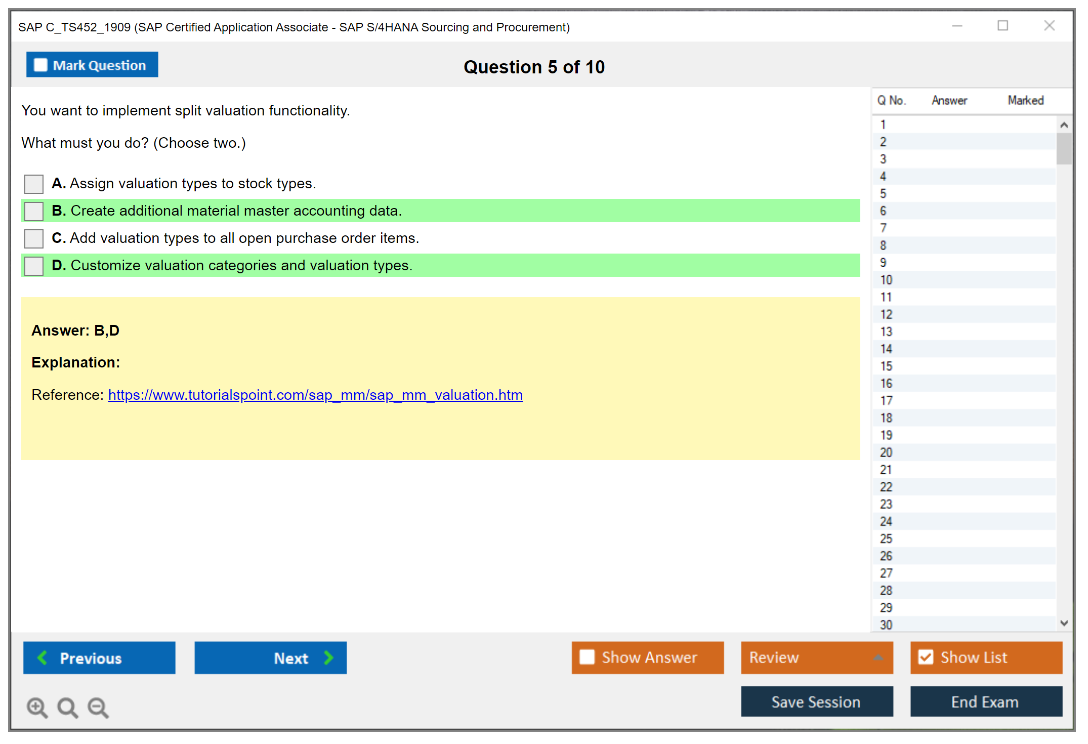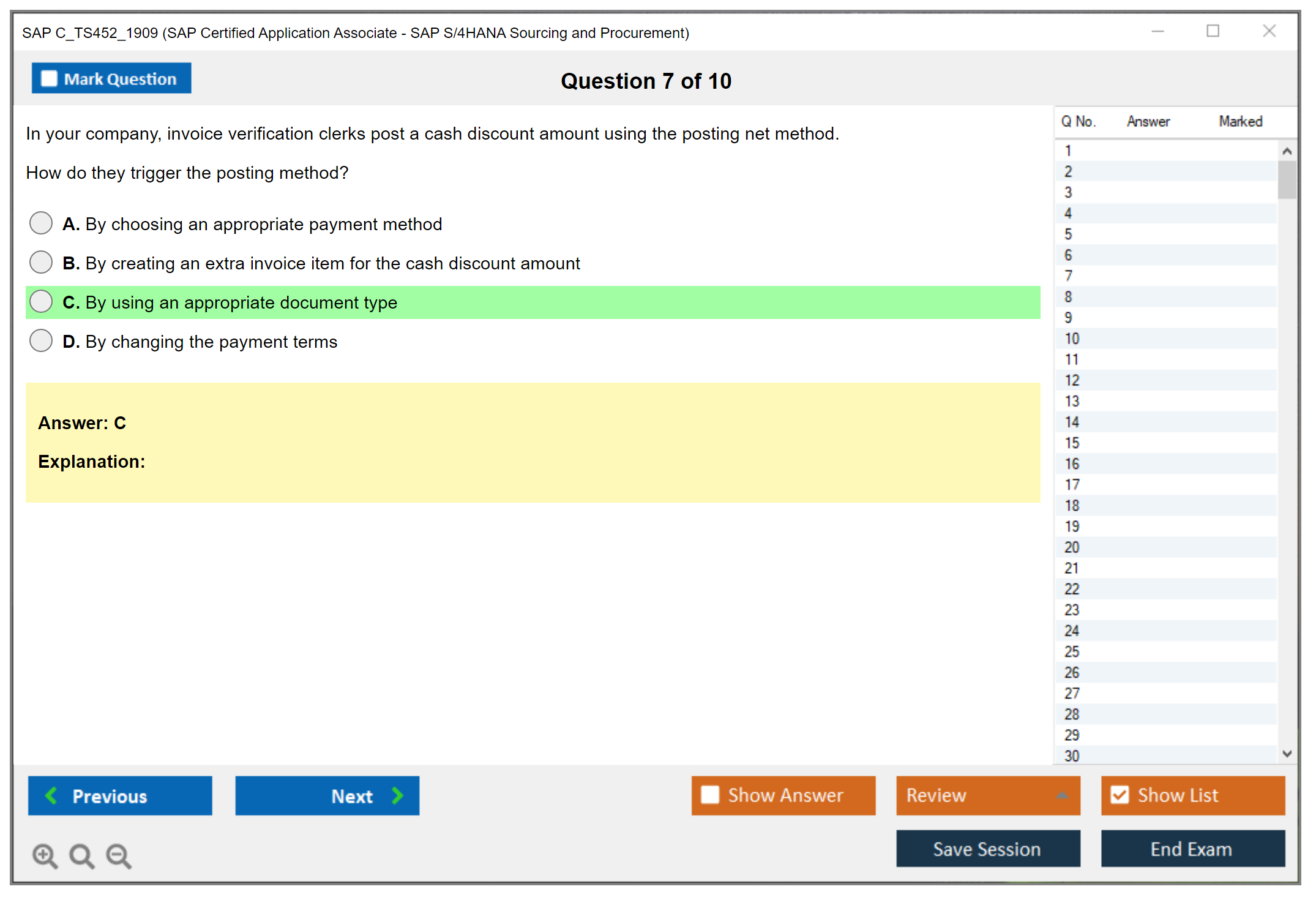 The SAP C_TS452_1909 exam, also known as SAP Certified Application Associate - SAP S/4HANA Sourcing and Procurement, is designed to validate the candidate's knowledge and skills in the area of SAP S/4HANA Sourcing and Procurement. This certification proves that the candidate has a fundamental understanding and in-depth technical skills to participate as a member of a project team in a mentored role.