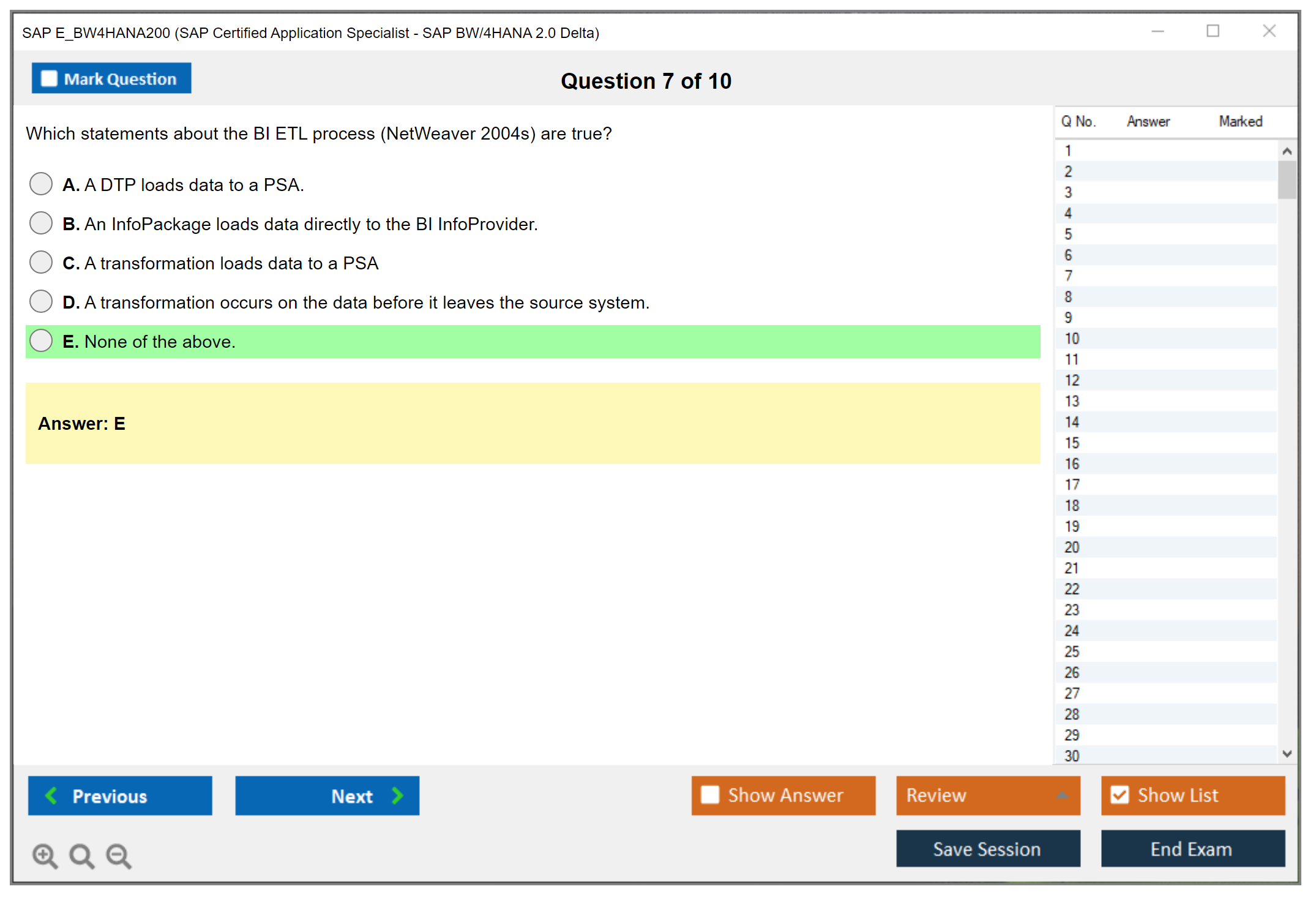 The SAP E_BW4HANA200 (SAP Certified Application Specialist - SAP BW/4HANA 2.0 Delta) exam is designed to validate that the candidate possesses the knowledge required to implement and configure SAP BW/4HANA 2.0. This certification proves that the candidate has an overall understanding and in-depth technical skills to participate as a member of a project team in a mentoring role.