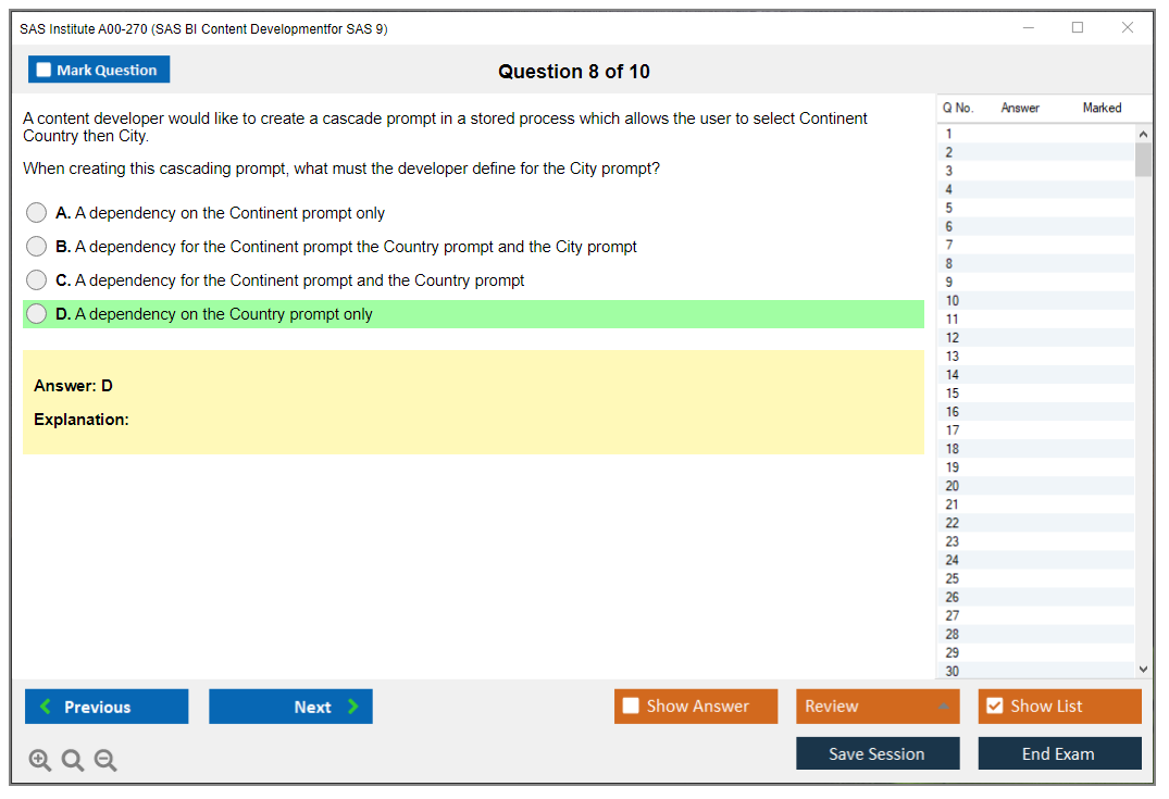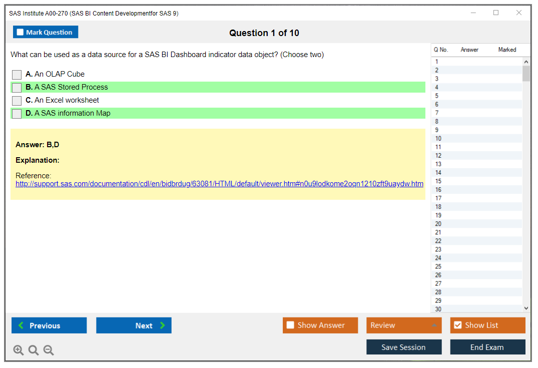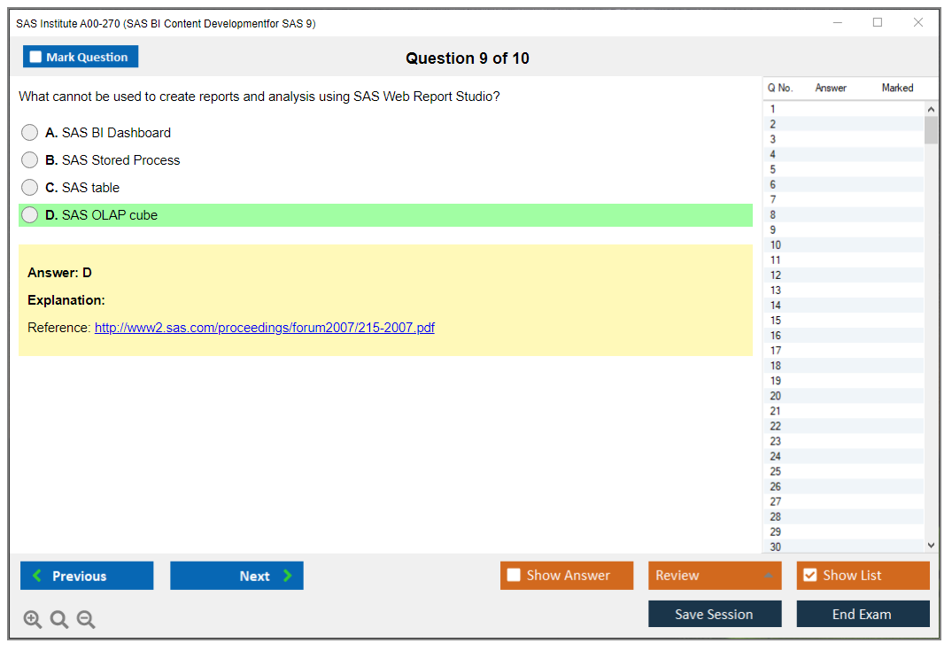 The SAS Institute A00-270 Exam is a certification test that validates a candidate's ability to develop and manage SAS Business Intelligence content using SAS 9. It assesses skills in various areas such as report creation, data integration, and deployment of BI solutions.