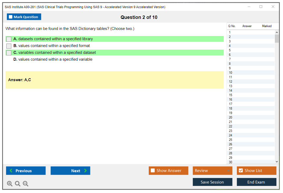 The question format of the SAS Institute A00-281 Exam includes multiple-choice questions, short answer questions, and scenario-based questions.