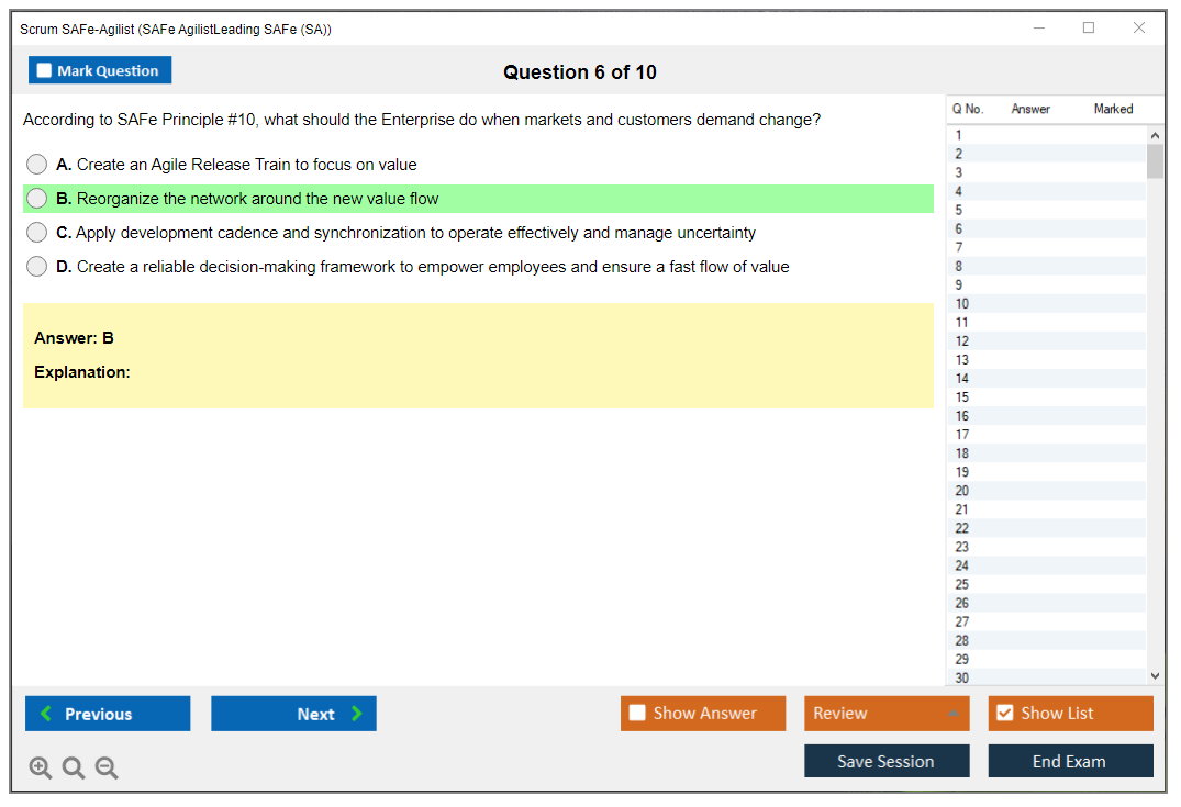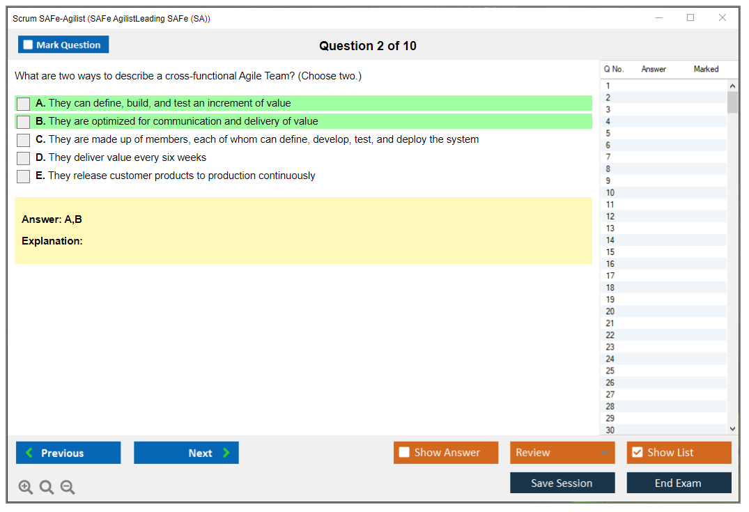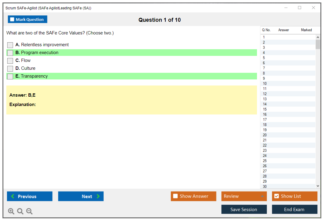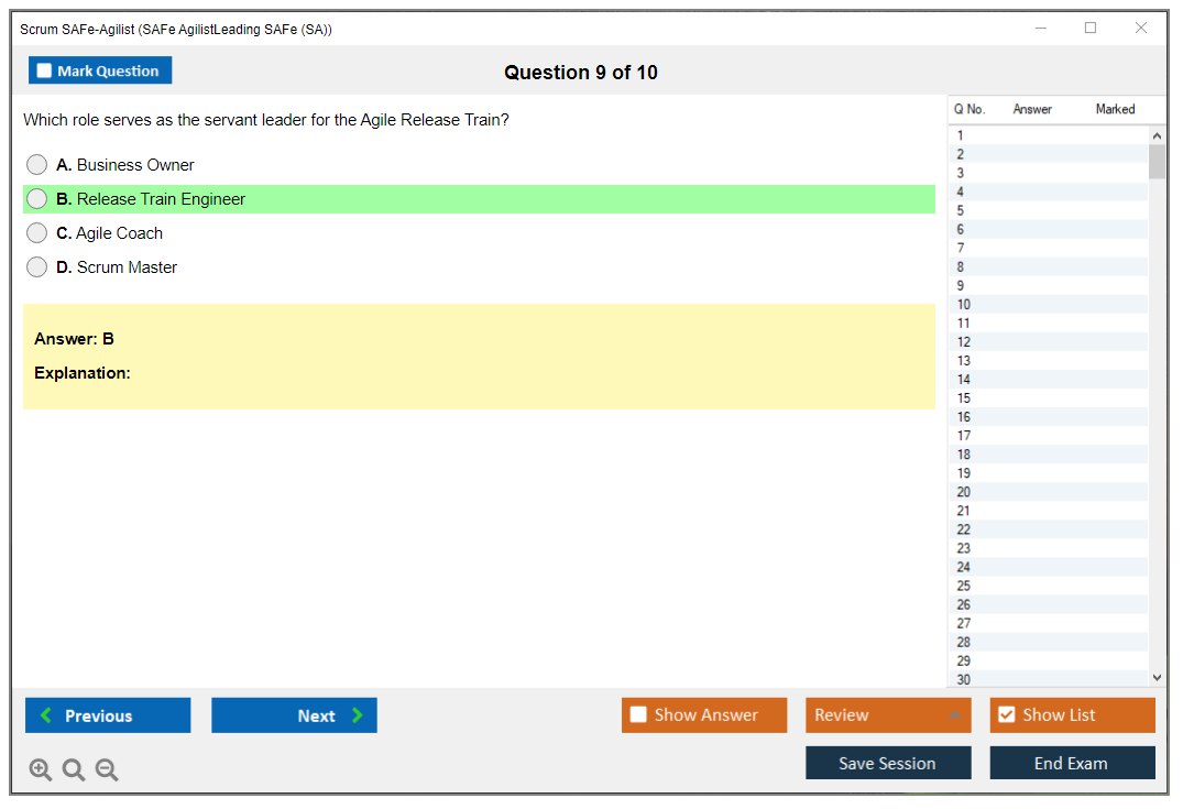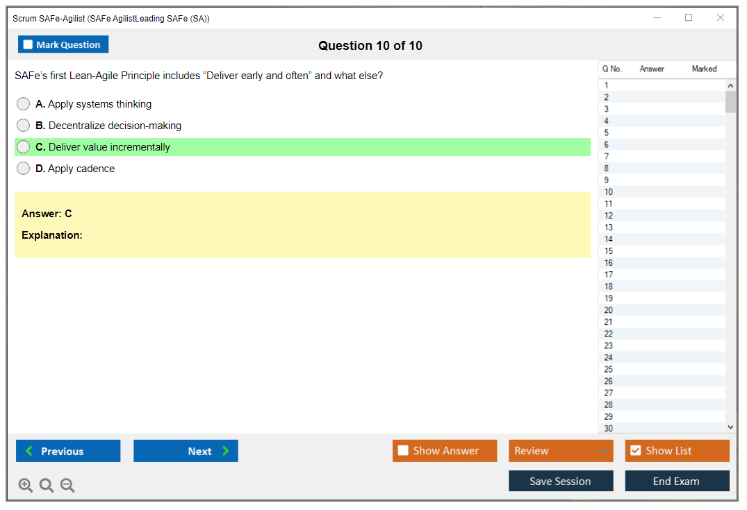 The Scrum SAFe-Agilist (SAFe Agilist - Leading SAFe (SA)(5.1.1)) exam is a certification test designed to validate an individual's understanding of the Scaled Agile Framework (SAFe) and their ability to lead agile transformations within an organization. It covers key concepts such as Lean-Agile principles, SAFe practices, and the implementation of agile methodologies at scale.
