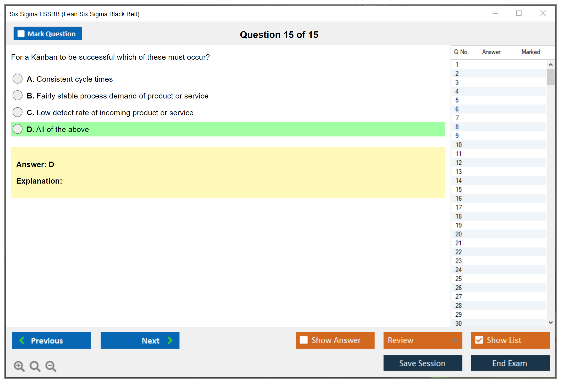 The Six Sigma Lean Six Sigma Black Belt (LSSBB) exam is designed to assess the knowledge and skills of individuals in applying Six Sigma methodologies and Lean principles to improve processes and drive business performance.
