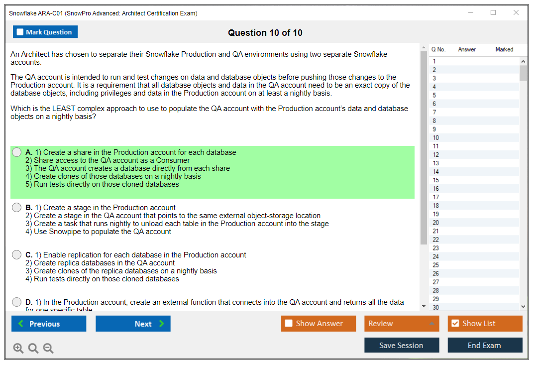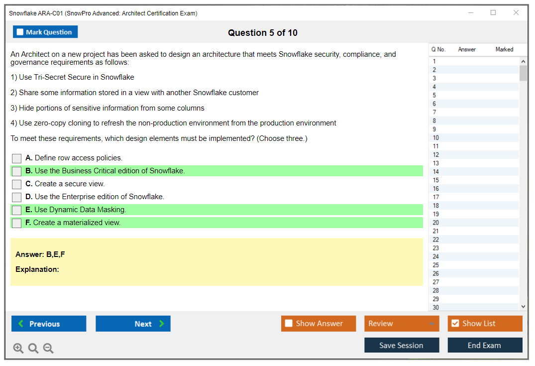 The Snowflake ARA-C01 (SnowPro Advanced: Architect Certification Exam) is designed to test advanced knowledge and skills in Snowflake's cloud data platform. It validates the expertise of individuals in designing, building, and managing secure, scalable Snowflake solutions.