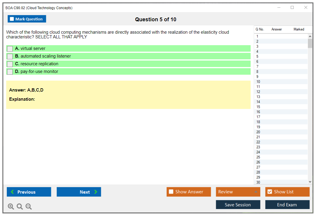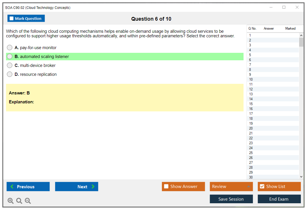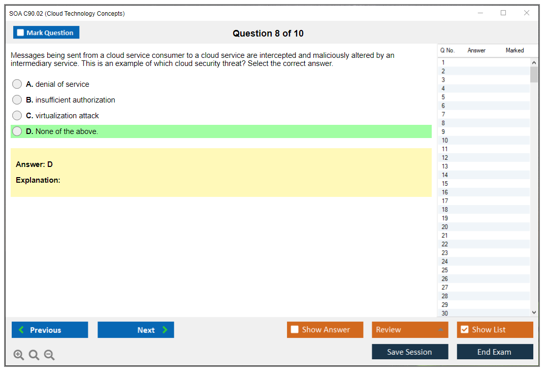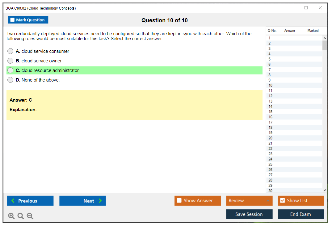 The SOA C90.02 Exam is designed to validate an individual's understanding of core cloud computing concepts and technologies. It covers topics such as cloud delivery models, cloud computing mechanisms, and cloud security mechanisms.