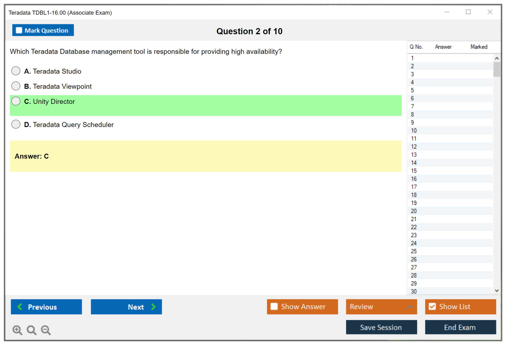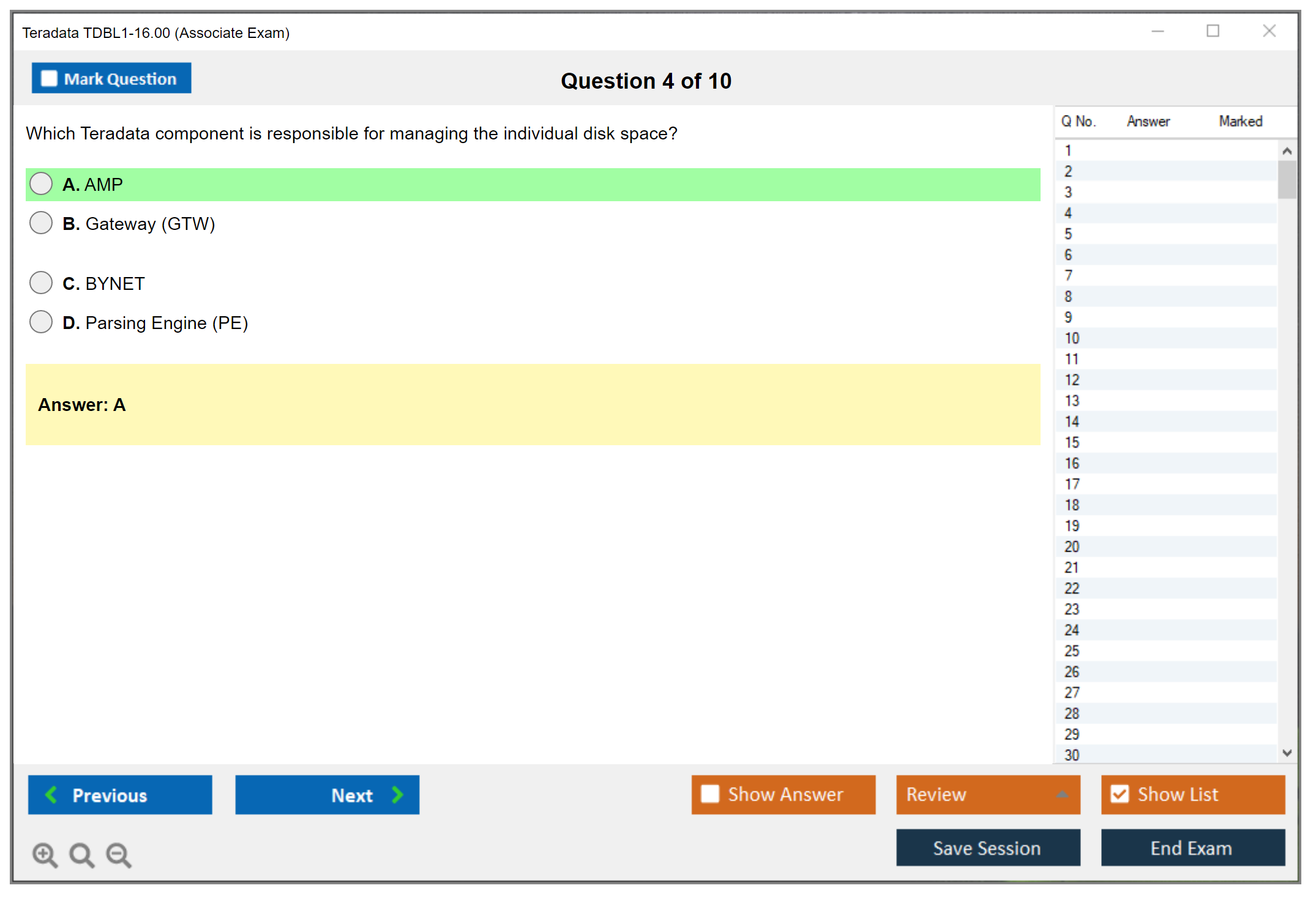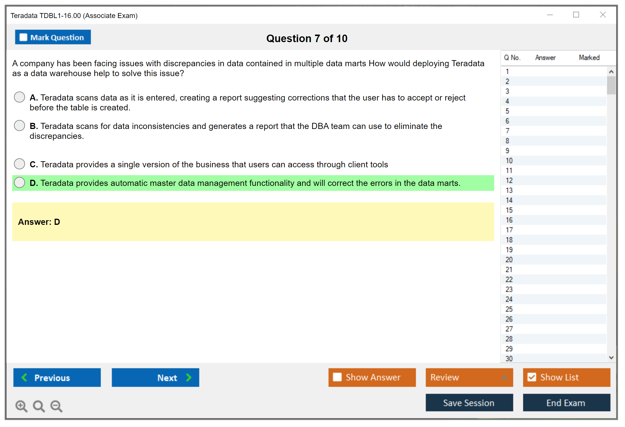The Teradata TDBL1-16.00 (Associate Exam) is designed to validate the knowledge and skills of individuals in using Teradata database technologies. It covers a range of topics including database administration, SQL, and Teradata architecture.