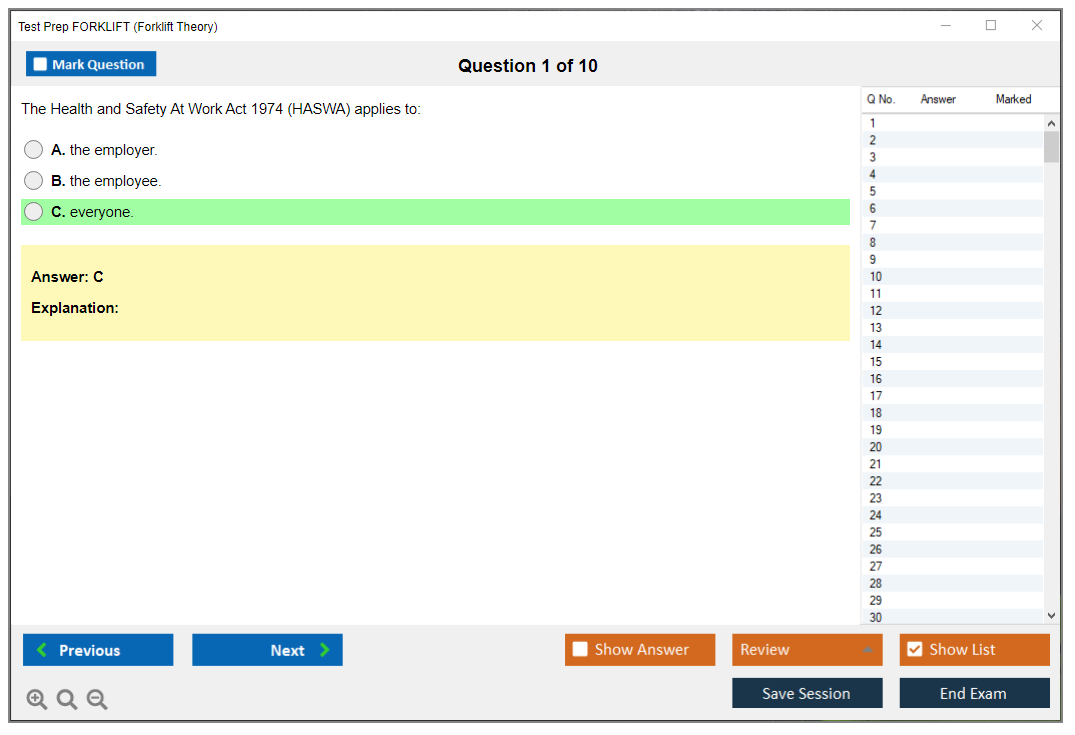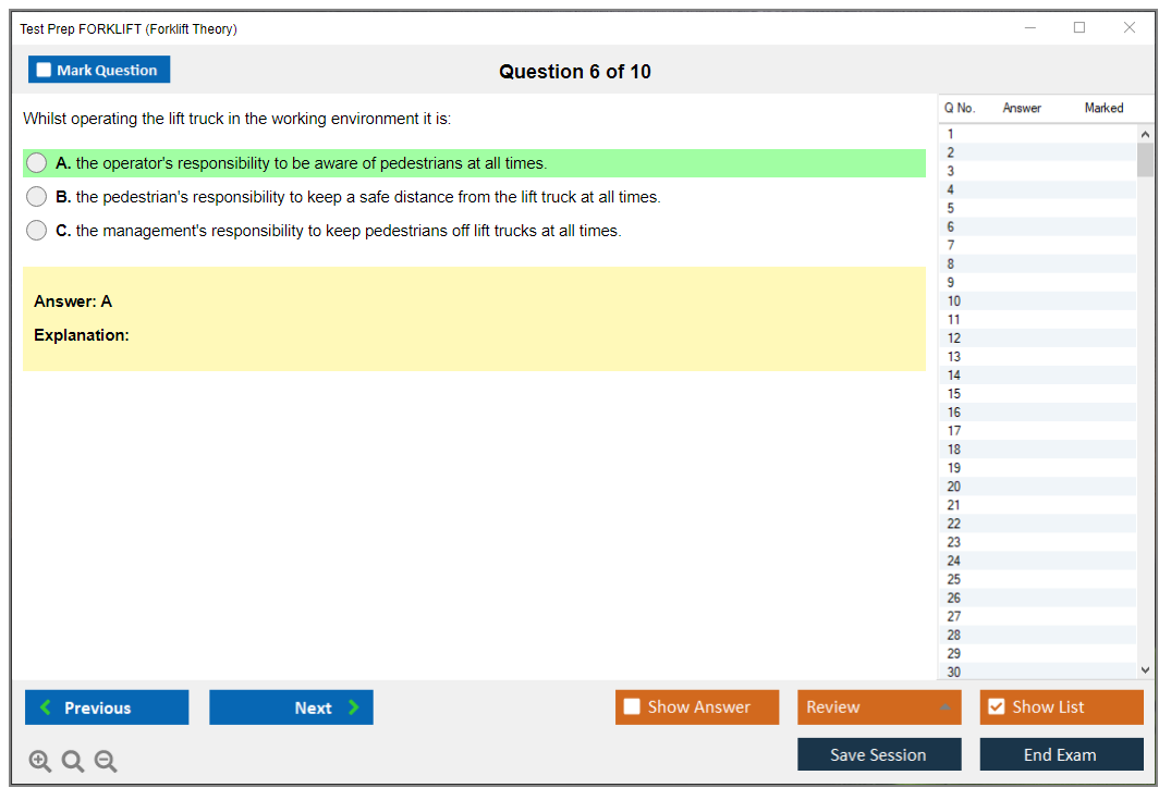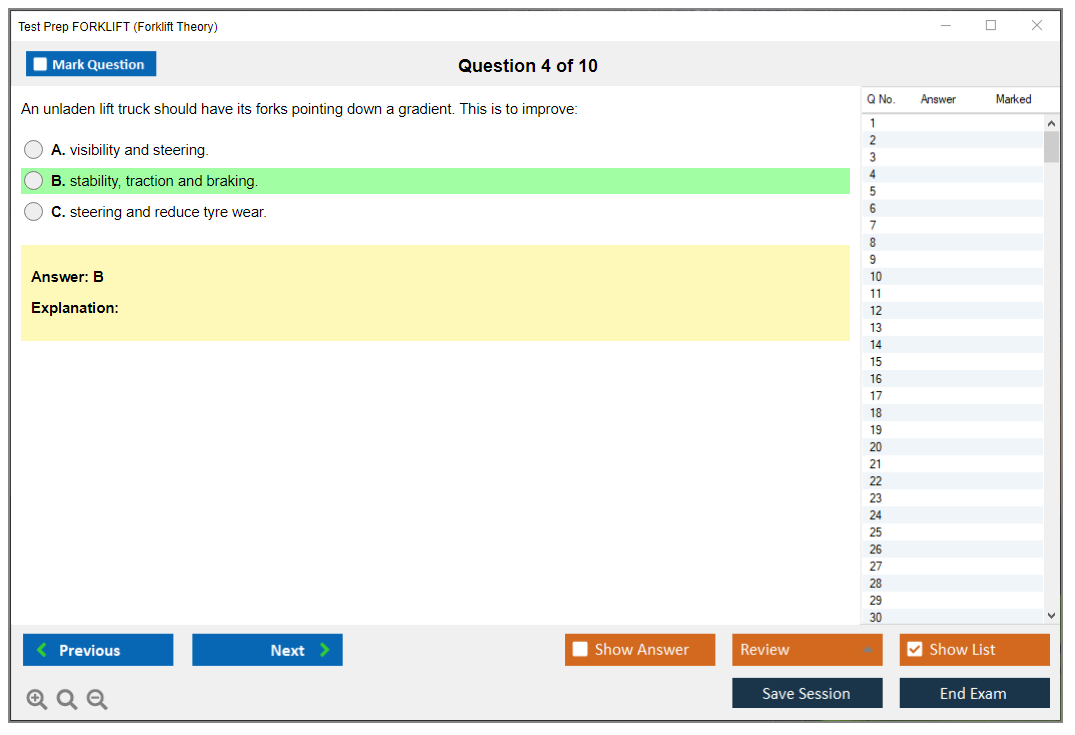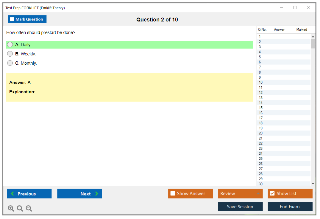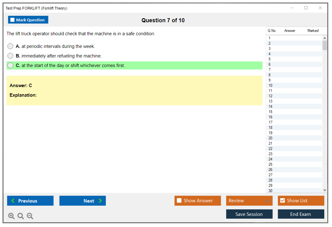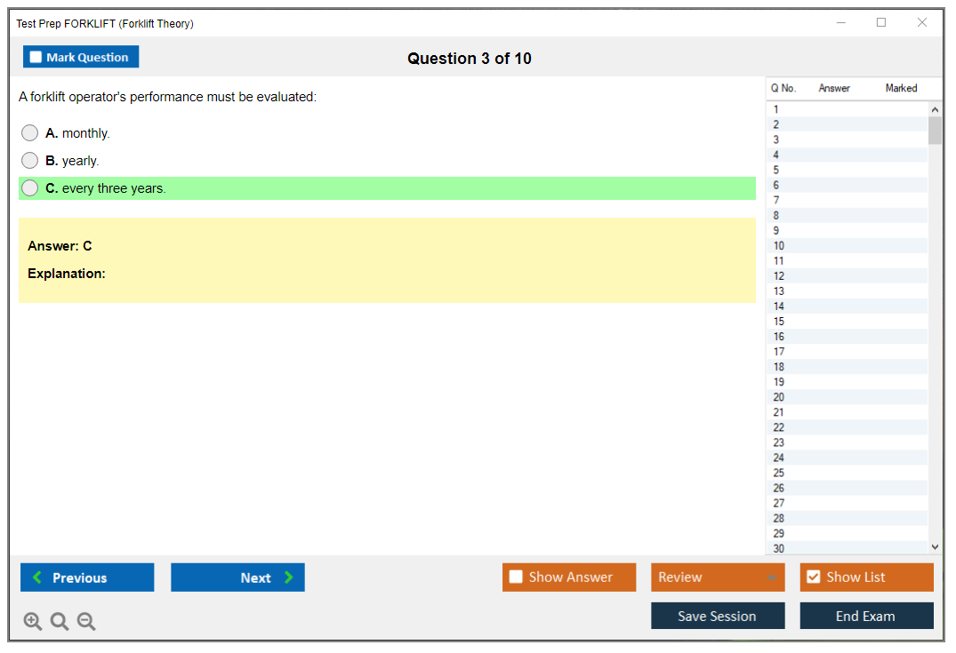 The question format of the Test Prep FORKLIFT Exam is primarily multiple-choice, with some true/false and situational judgment questions.