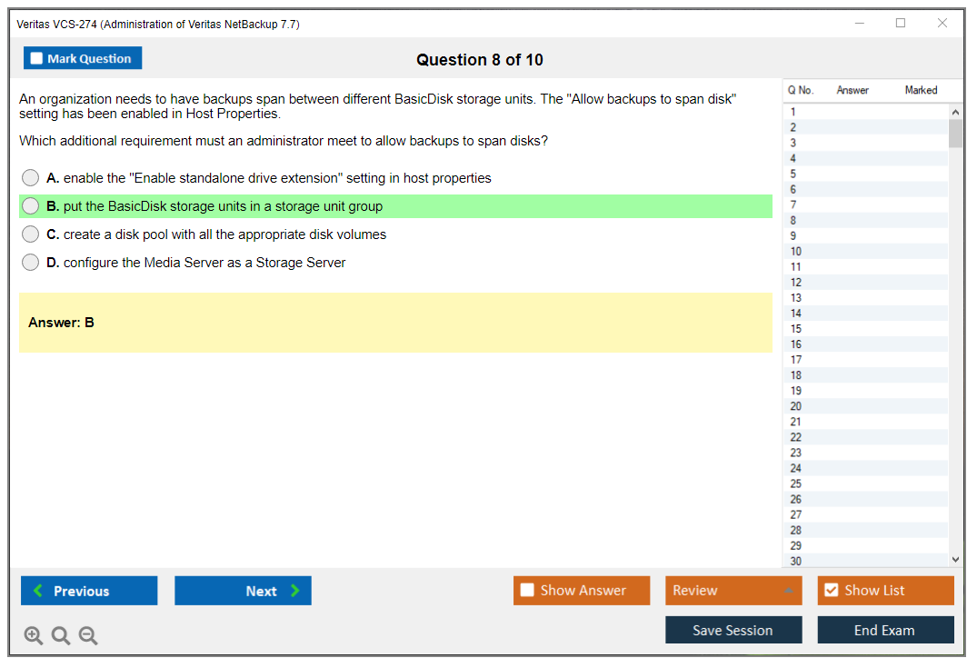 The Veritas VCS-274 (Administration of Veritas NetBackup 7.7) exam is designed to validate the knowledge and skills of IT professionals in administering Veritas NetBackup 7.7 environments. The exam covers a variety of topics including installation, configuration, maintenance, and troubleshooting of NetBackup software.