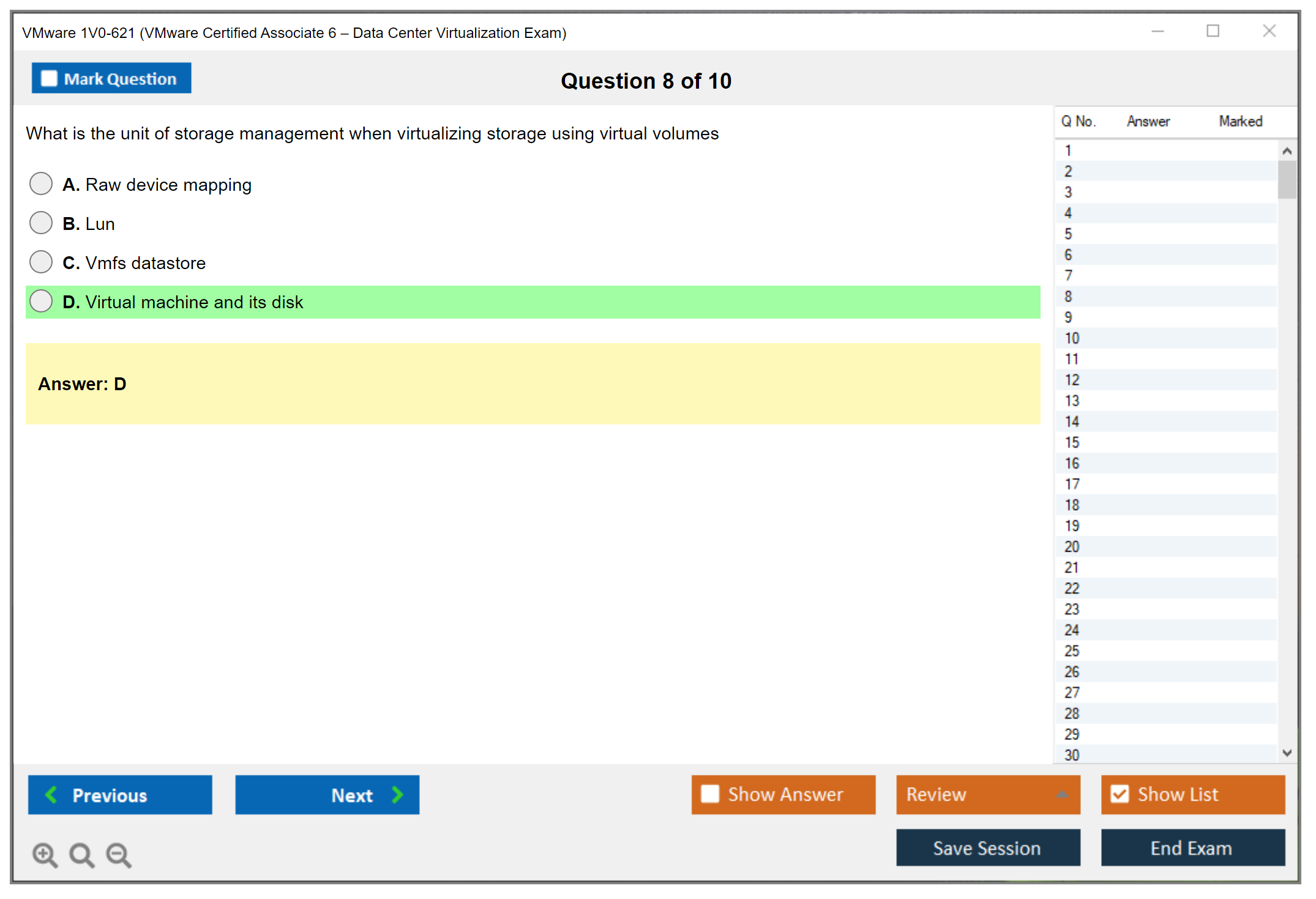 The VMware 1V0-621 (VMware Certified Associate 6 – Data Center Virtualization Exam) is designed to validate a candidate's understanding of virtualization technology and VMware products. It focuses on fundamental concepts of VMware vSphere and the ability to perform basic tasks with VMware vSphere environments.