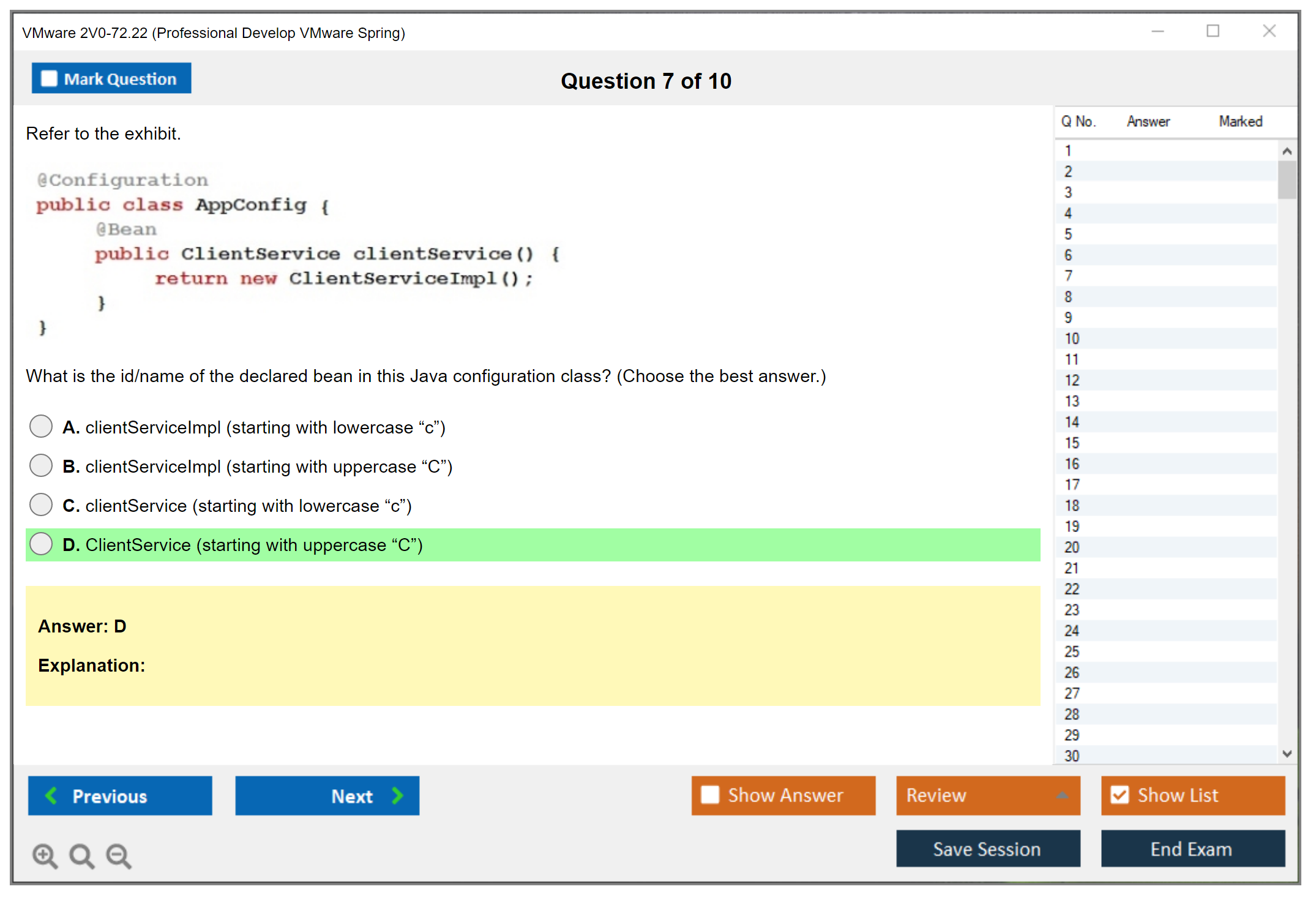 The VMware 2V0-72.22 (Professional Develop VMware Spring) exam validates a candidate's knowledge and skills in using the Spring framework to develop Java applications. It is designed for professionals who work with Spring and want to demonstrate their expertise.