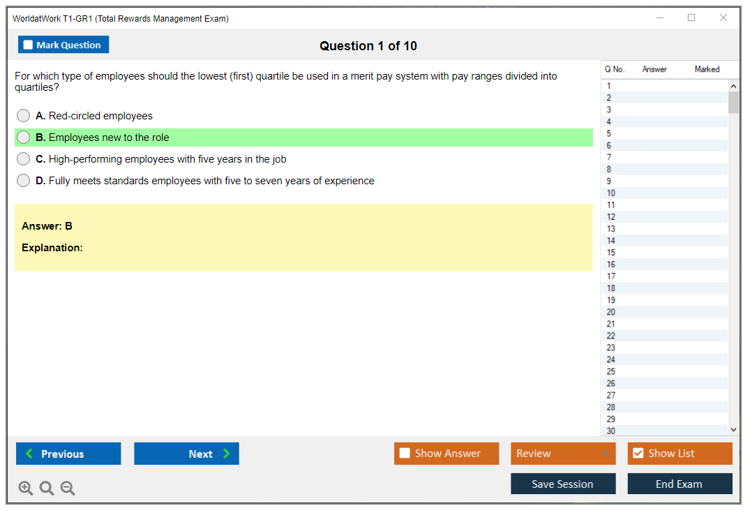 The question format of the WorldatWork T1-GR1 Exam is multiple-choice.